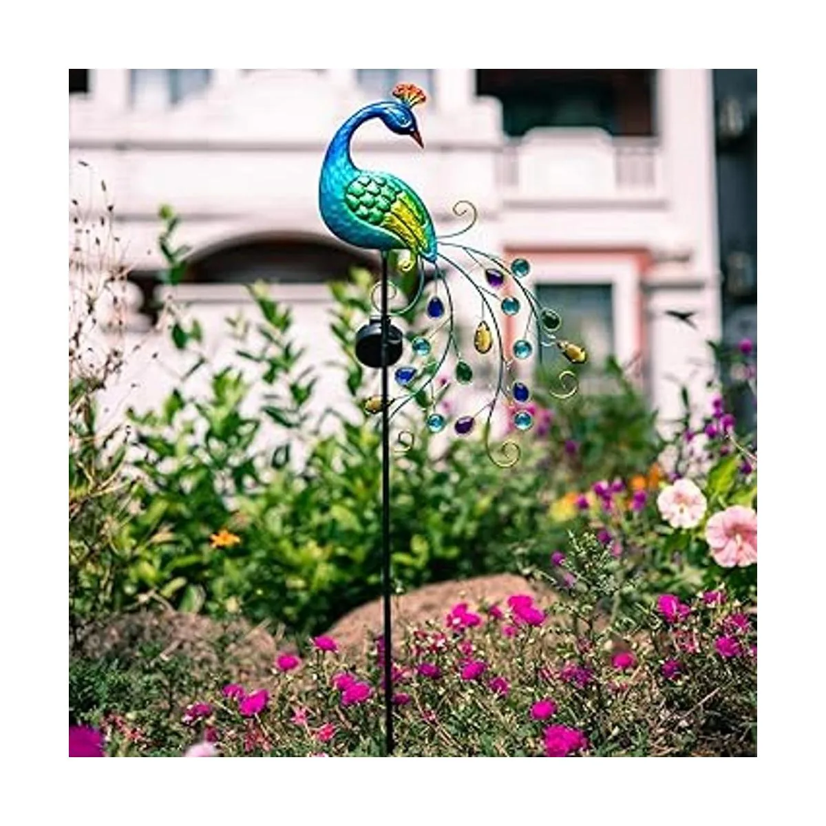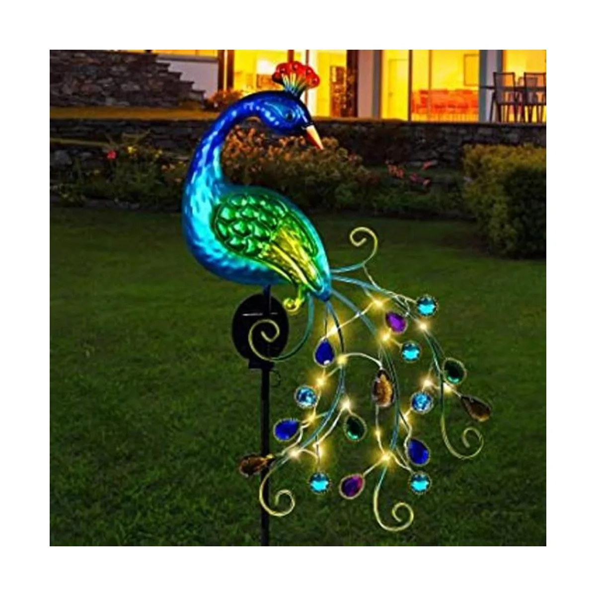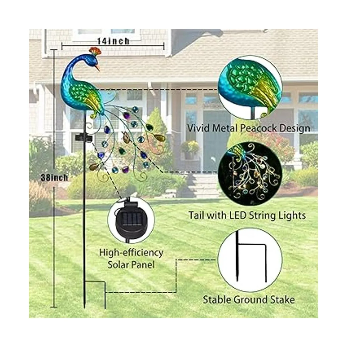 Luces de jardín de larga duración: la luz solar de jardín de pavo real está hecha de hierro de metal duradero y resistente con tratamiento de revestimiento de pintura antioxidante. Clasificación de impermeabilidad IP65, resistente a la decoloración, resistente a la corrosión, adecuado para cualquier entorno al aire libre, no te preocupes por el sol, la lluvia, la nieve, etc.