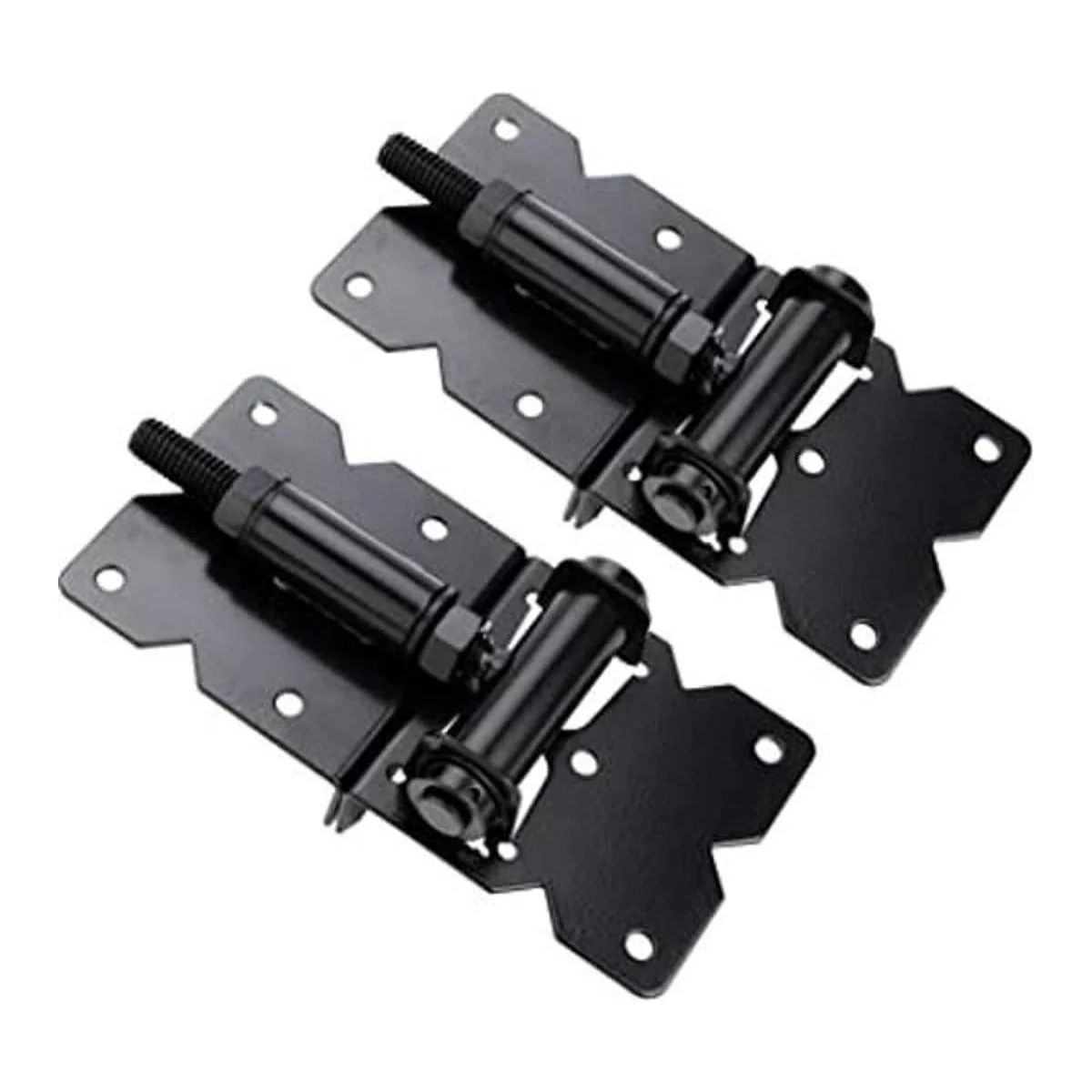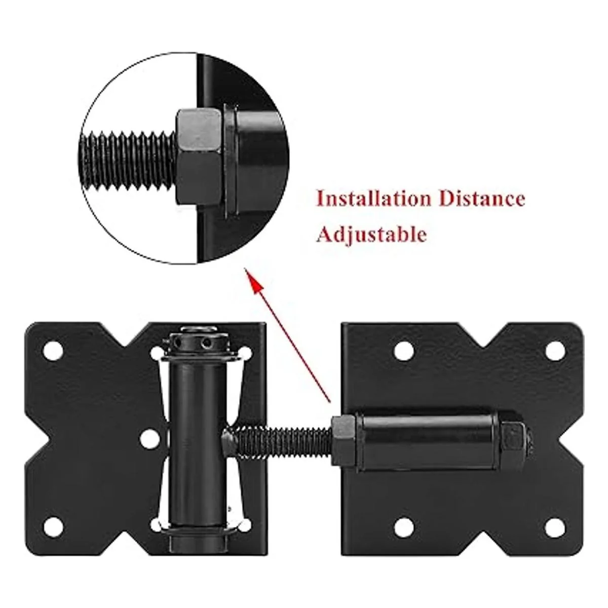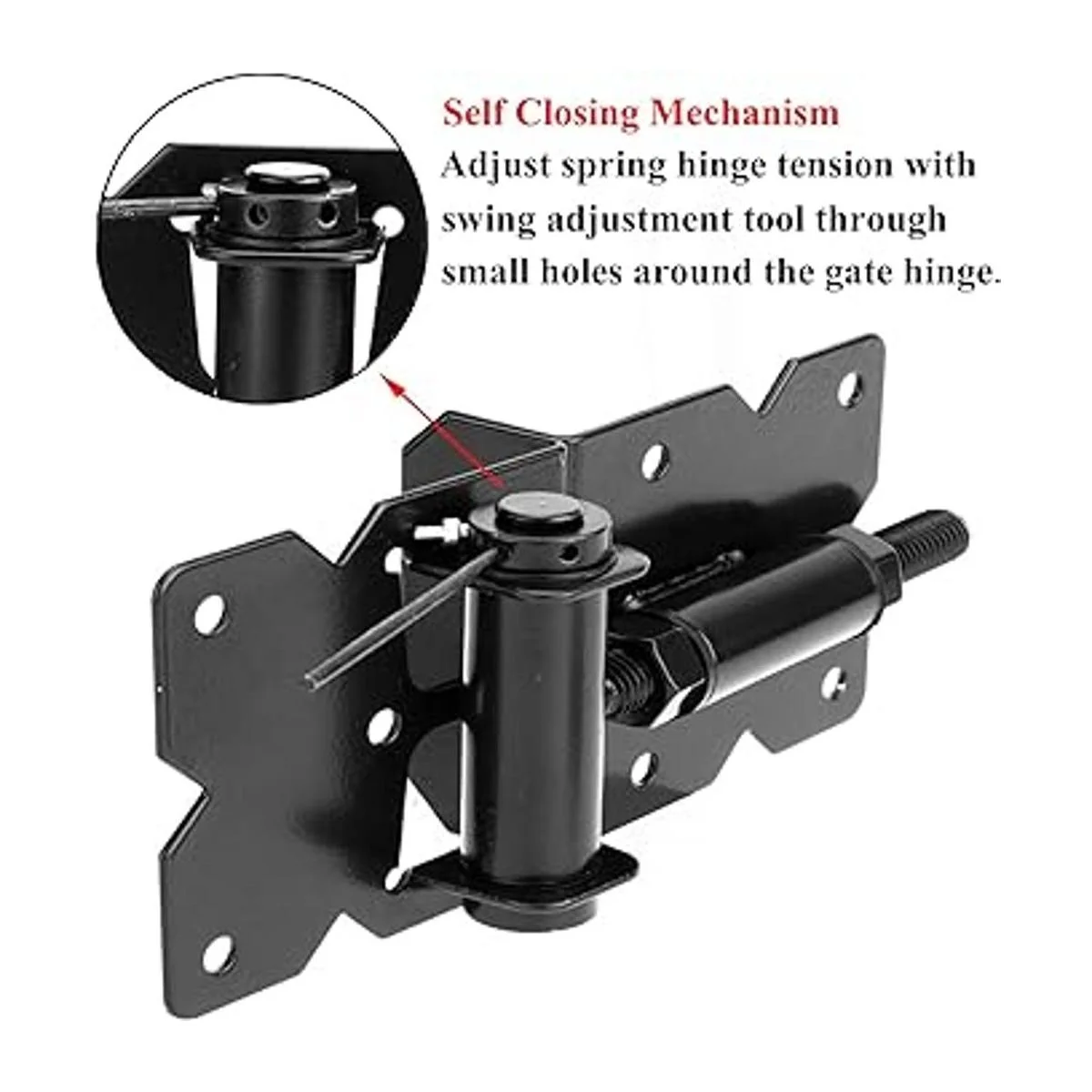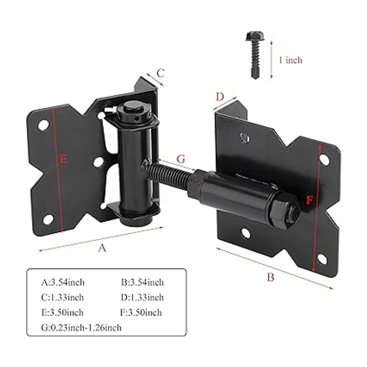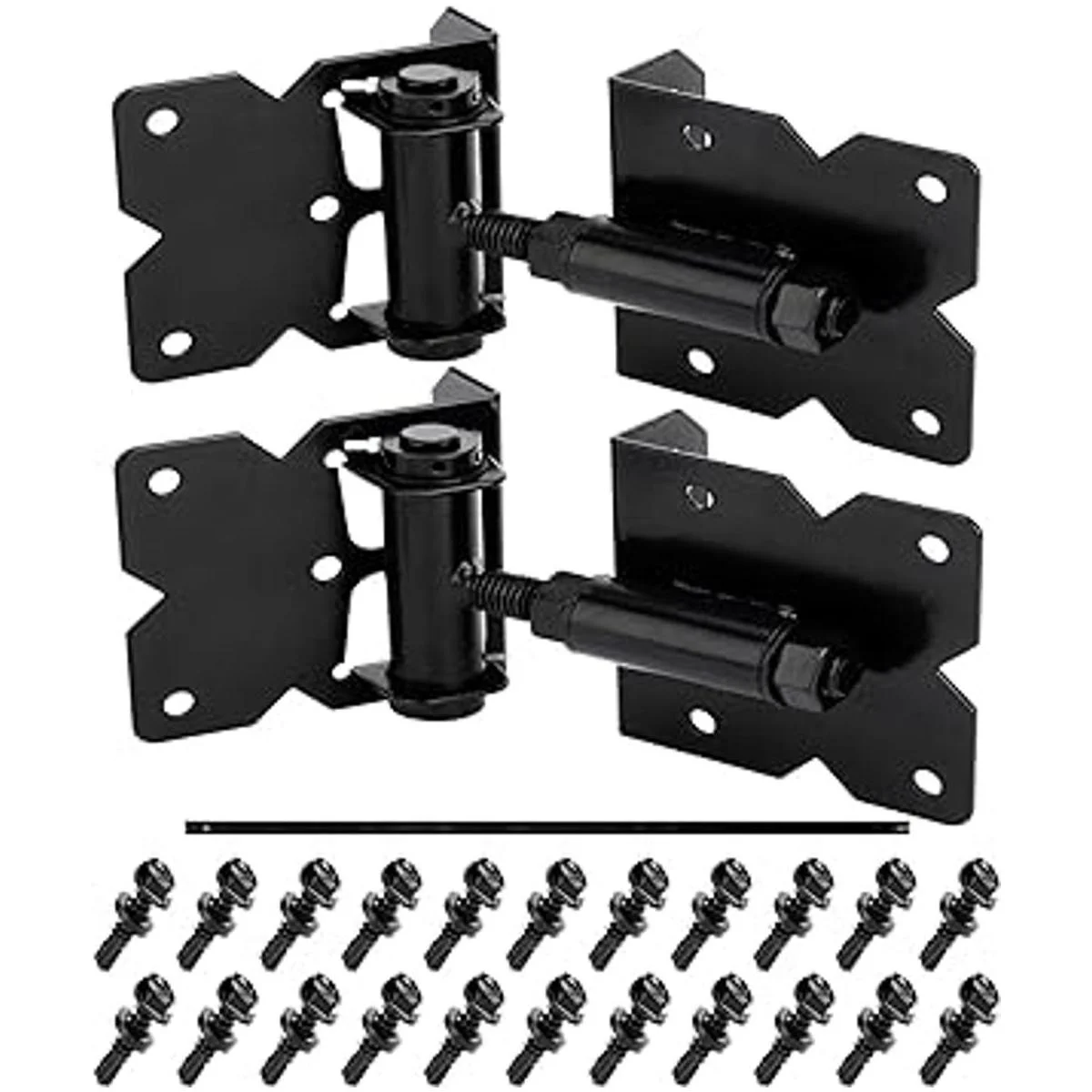 Dreamxiang Bisagras de puerta de cierre automático ajustables y resistentes, kit de bisagras de puerta de 90 grados para madera, vinilo, metal, valla al aire libre, con tornillos autorroscantes y herramienta de ajuste de columpio, paquete de 2, acabado negro