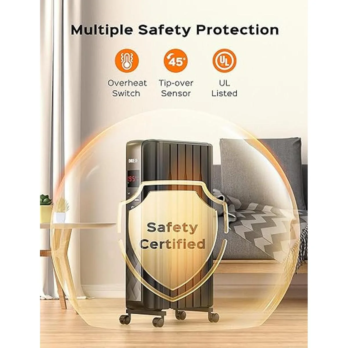 Seguridad mejorada: el calentador de radiador relleno de aceite Dreo hecho de materiales ignífugos V0 fue certificado por UL. Interruptor de vuelco integrado, el calentador lleno de aceite Dreo se apagará automáticamente mientras se vuelca por accidente para garantizar que tú y tu familia estén seguros y sin preocupaciones