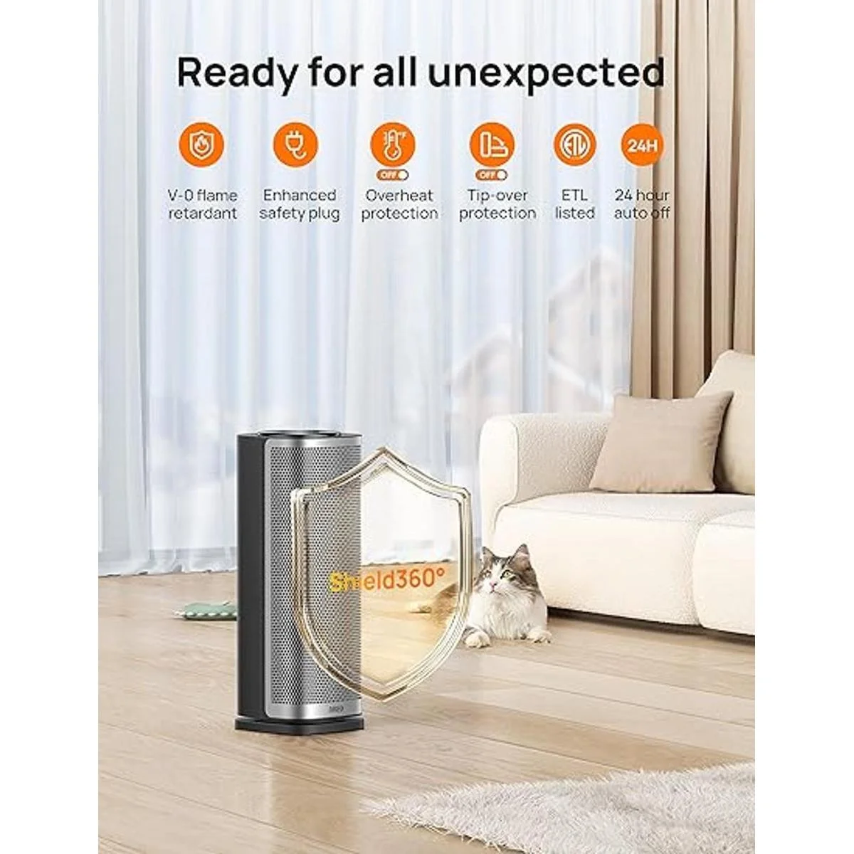 Múltiples características de seguridad: Materiales ignífugos con clasificación V0, sensor de sobrecalentamiento, interruptor de vuelco, apagado automático después de 24 horas sin operación y otros mecanismos integrados con certificación ETL son potentes respuestas a tus preocupaciones sobre la seguridad de este calentador de espacio