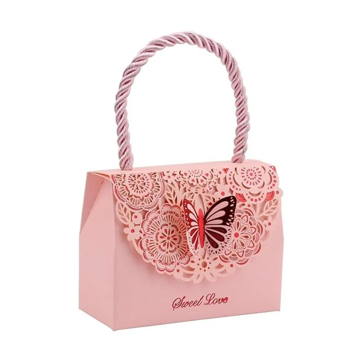 Características: nuestra caja de regalo tiene un diseño de bolso, cómodo de llevar; cierre de mariposa estereoscópico; patrón de flores huecas láser; fácil de montar; adecuado para la mayoría de las ocasiones