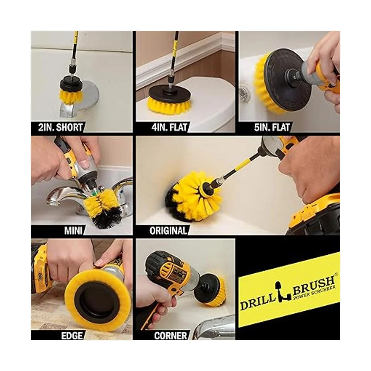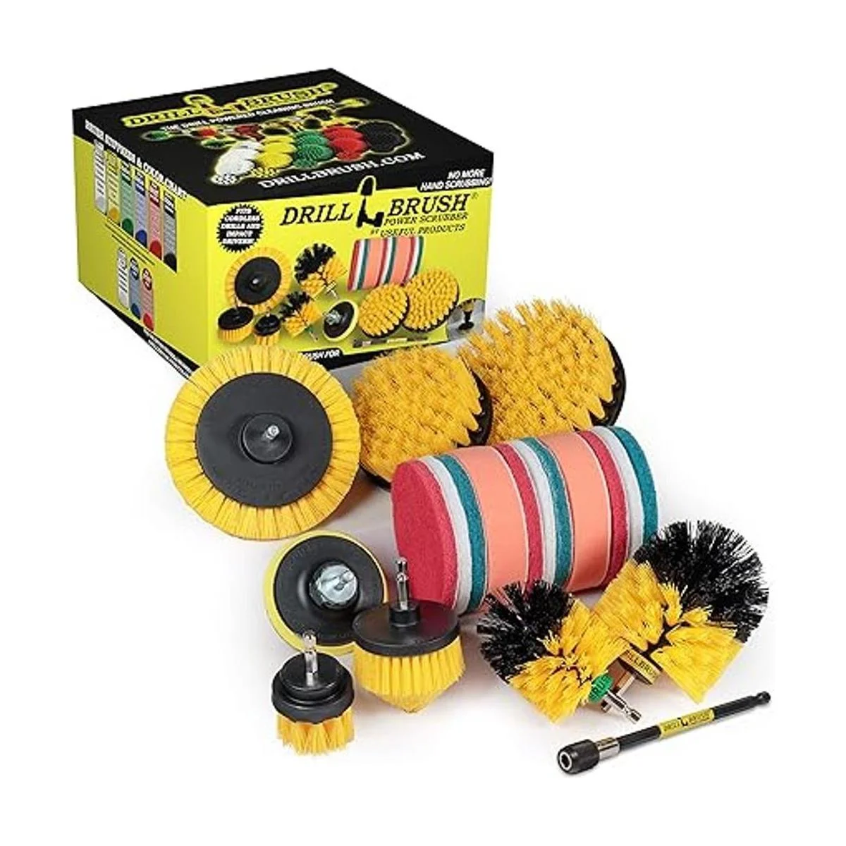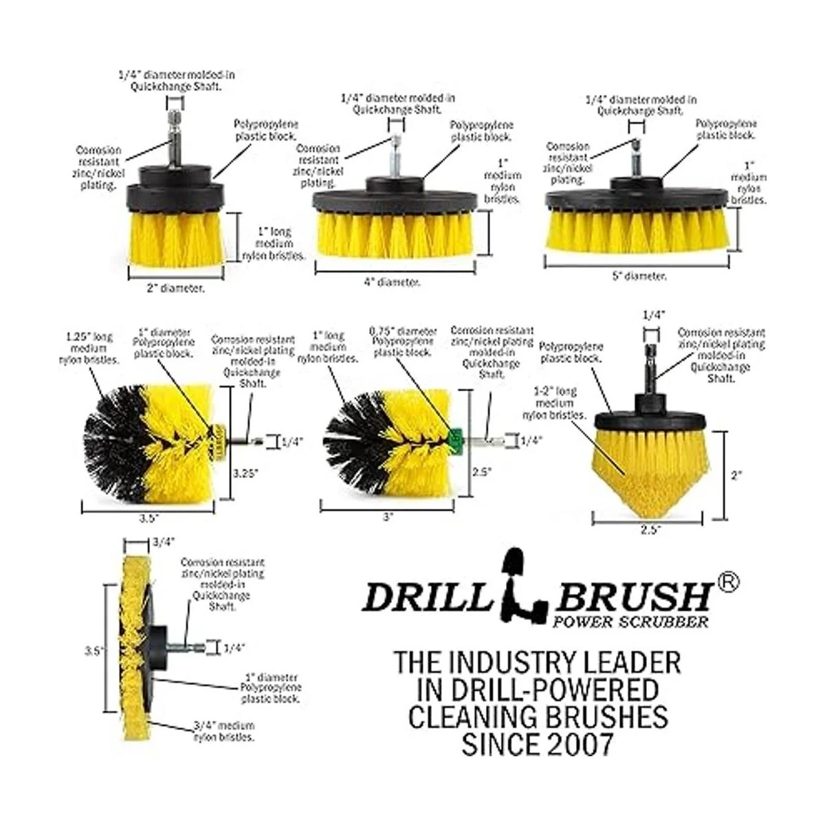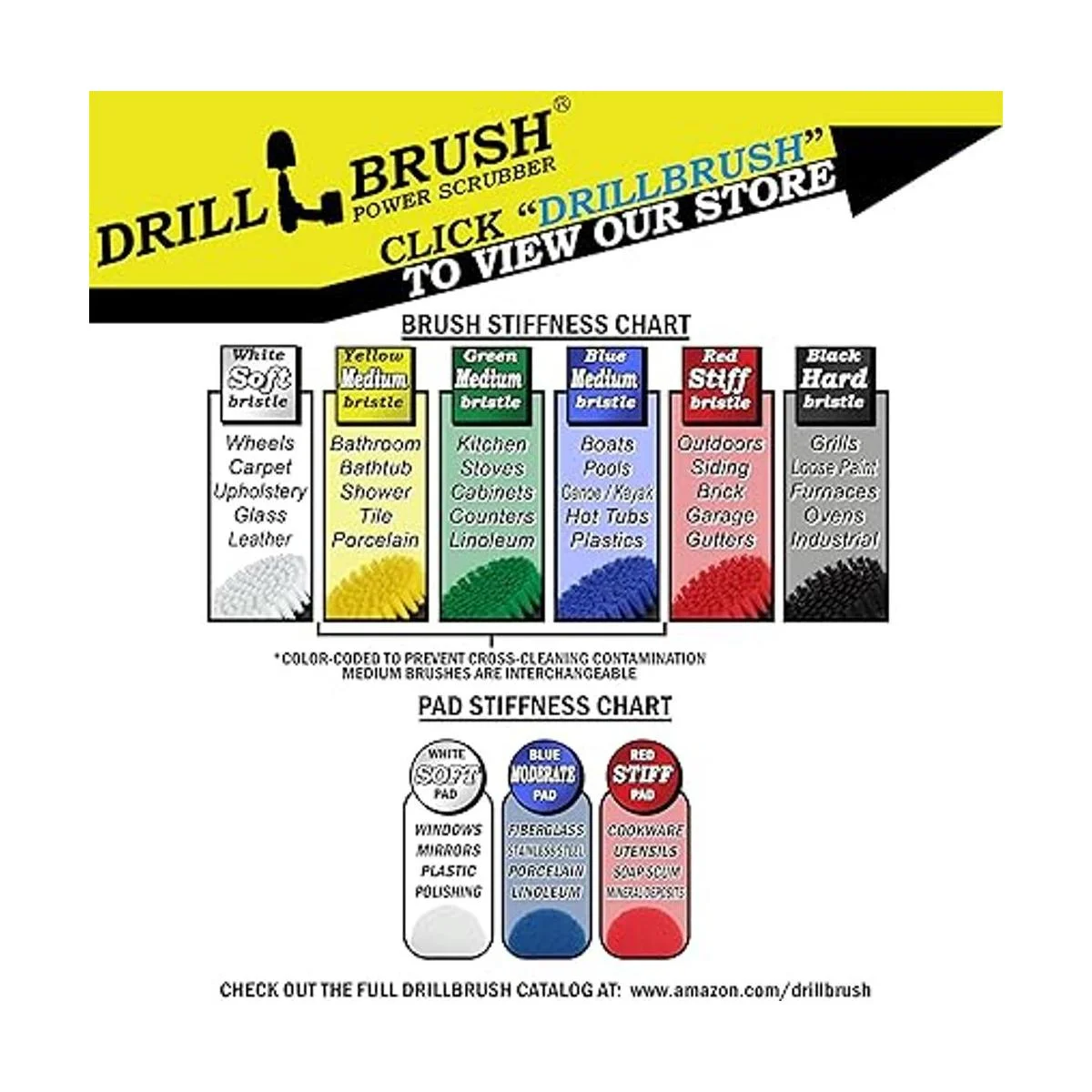 Este juego de cepillos de 21 piezas incluye 8 cepillos de limpieza únicos para taladros en nuestra rigidez media amarilla para asegurar que tienes el tamaño correcto para convertir tu taladro en una máquina de limpieza de baño. Este kit también incluye 4 tipos diferentes de almohadillas, nuestro blanco suave, rojo moderado, azul rígido y naranja espuma para asegurar que tienes la rigidez adecuada para hacer frente incluso a las necesidades de limpieza de puertas de ducha.