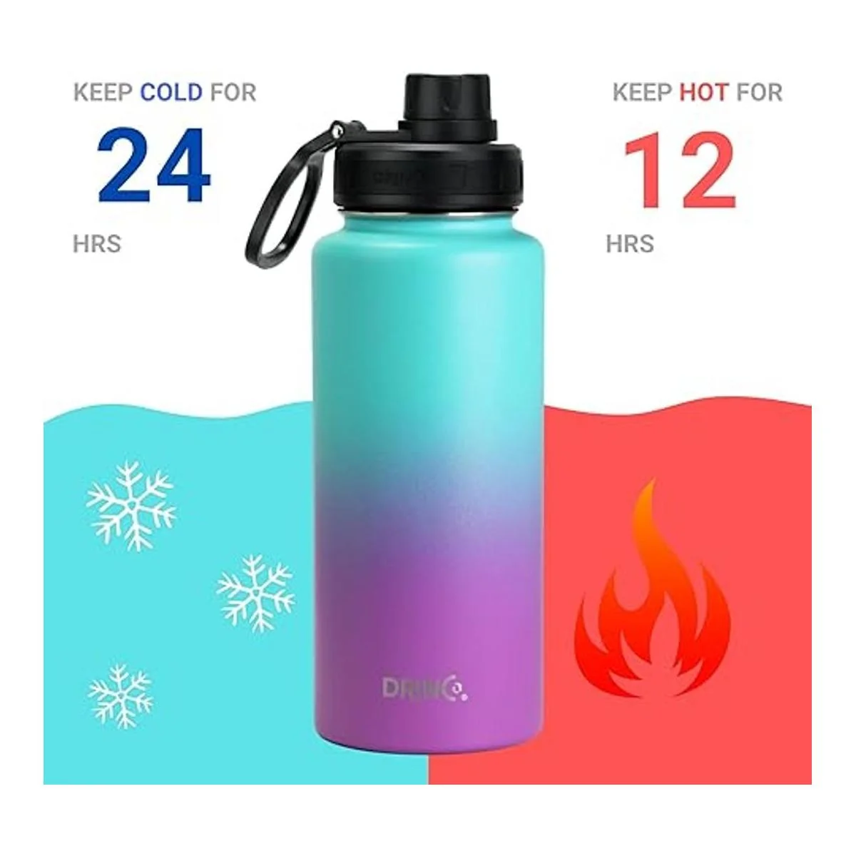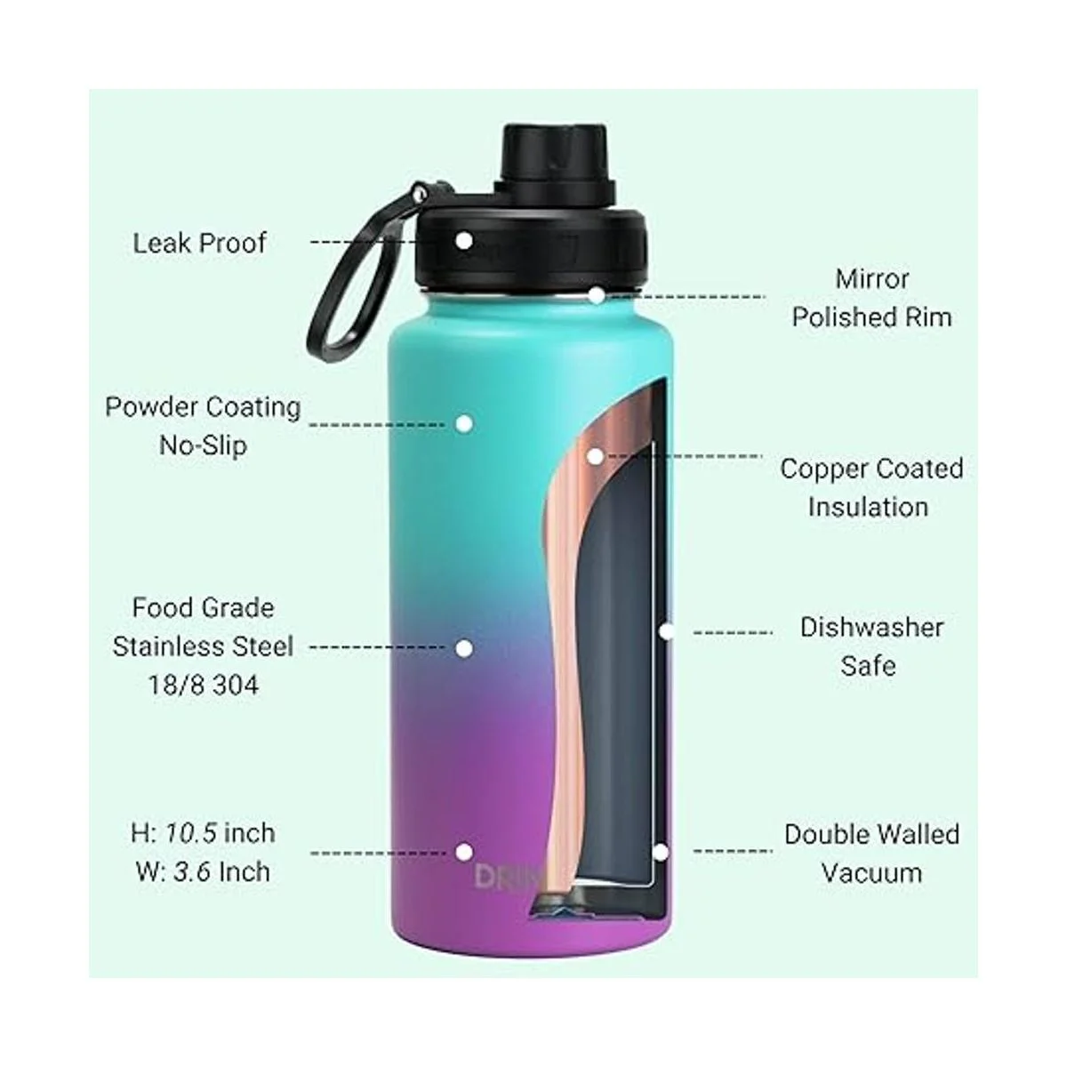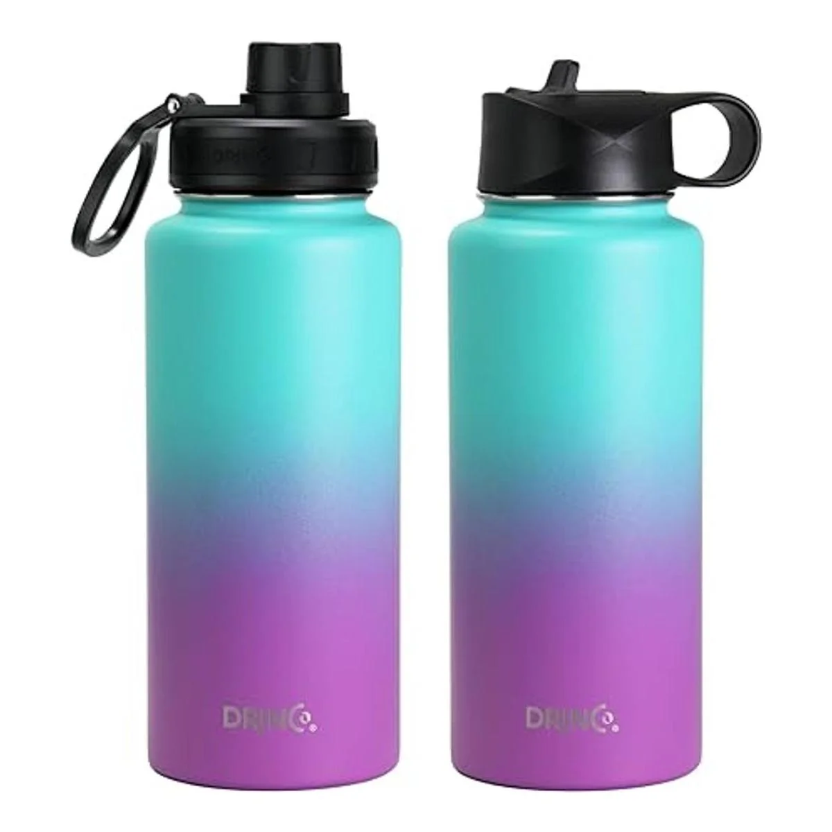 Drinco Botella de agua de acero inoxidable con boquilla, tapa aislada al vacío, botella de agua de doble pared, de boca ancha 40 onzas 32 onzas 22 onzas 18 onzas 14 onzas, a prueba de fugas, se mantiene fría o caliente 32 onzas, 32 onzas, verde azulado y fucsia degradado