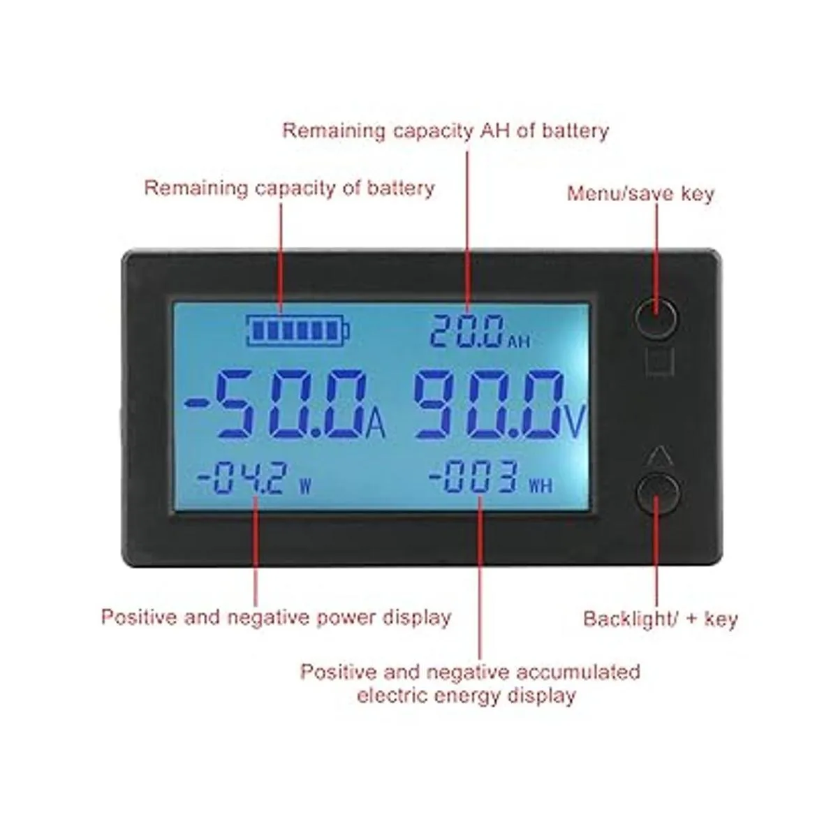 Medidor multifuncional: el panel multímetro DROK está disponible para medir el porcentaje y AH de la capacidad restante, corriente bidireccional positiva y negativa CC, voltaje positivo y negativo CC energía eléctrica acumulada bidireccional positiva y negativa. El rango de medición de voltaje es de 0 a 300 V CC, el rango de medición de corriente es de 0 a 200 A.