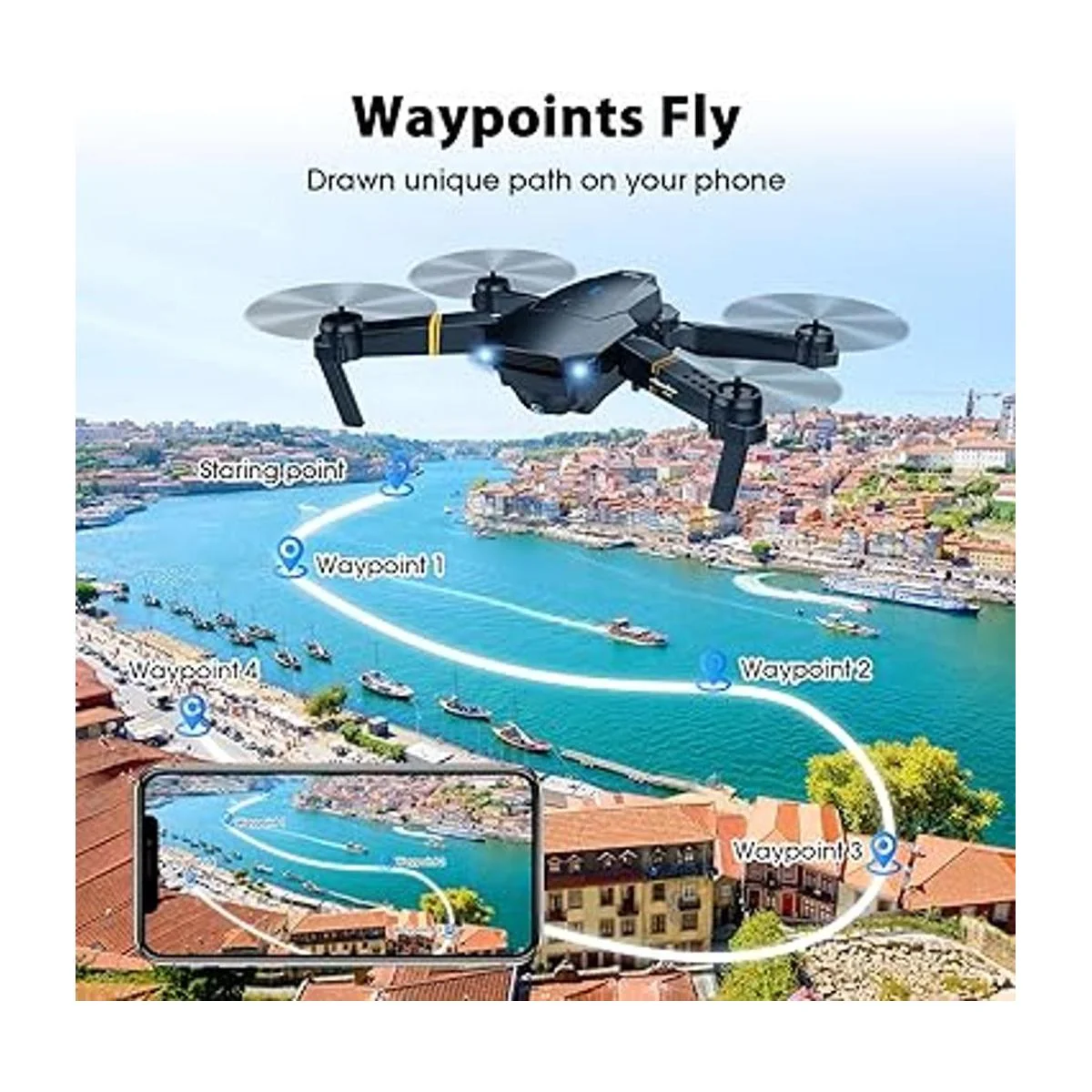 Transmisión WIFI FPV en tiempo real: con una cámara HD de 120 de gran angular y 1080P, el sistema FPV de transmisión en tiempo real puede conectarse a tu teléfono con el drone y la vista se mostrará directamente en tu teléfono, así podrás disfrutar del mundo por encima del horizonte, capturar fotos y grabar vídeos con precisión para vivir momentos extraordinarios.