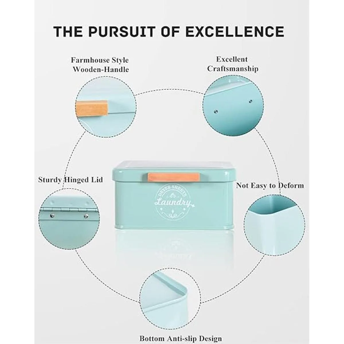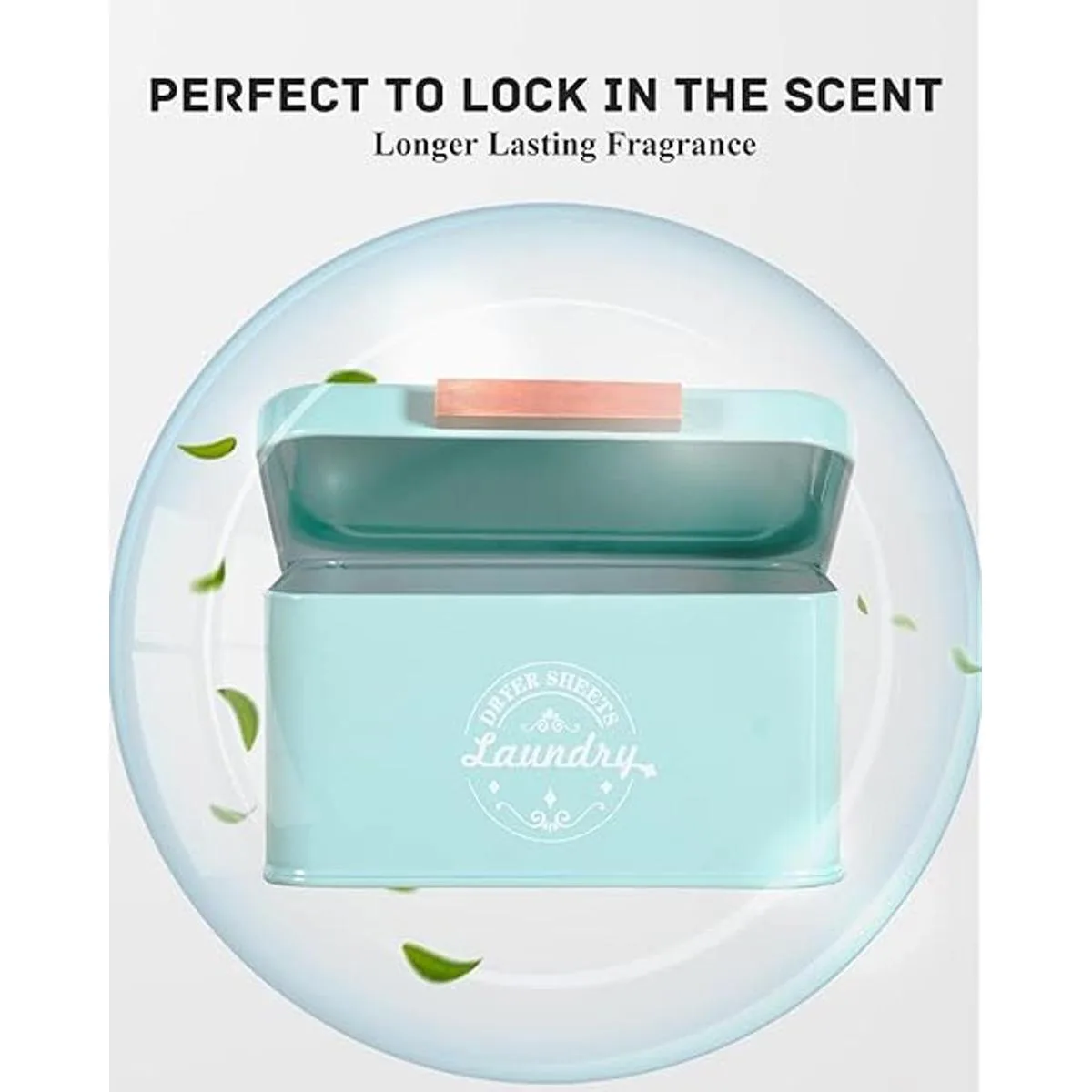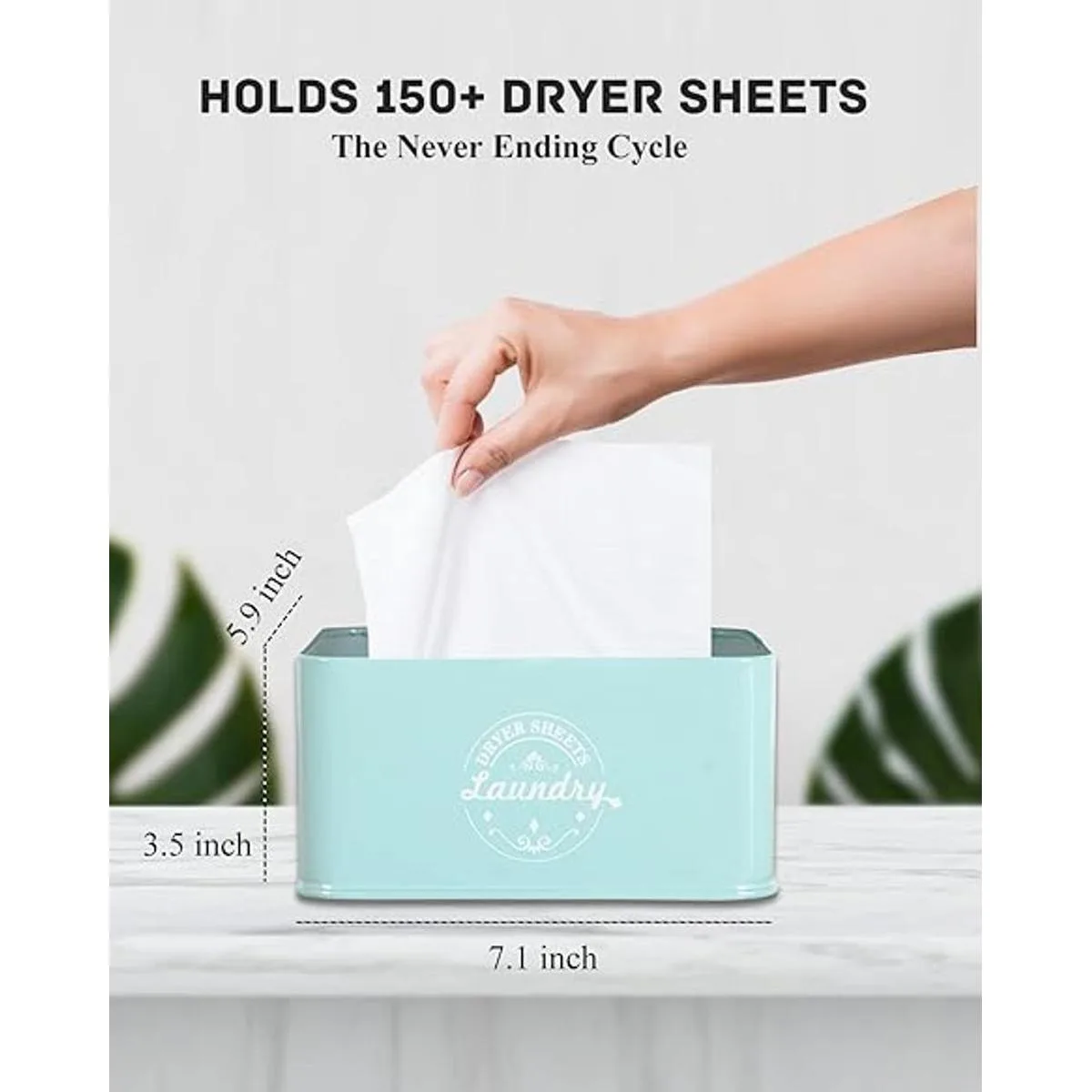 HIGHQUALITY MATERIAL Our dryer sheet holder with a lid made of sturdy tin metal, This dryer sheet dispenser is spacious enough with 763.5 inch size dimensions. It ensures longterm durability, perfect for everyday use. Dryer sheet storage holds up to 180 standardsize fabric softener sheets.
