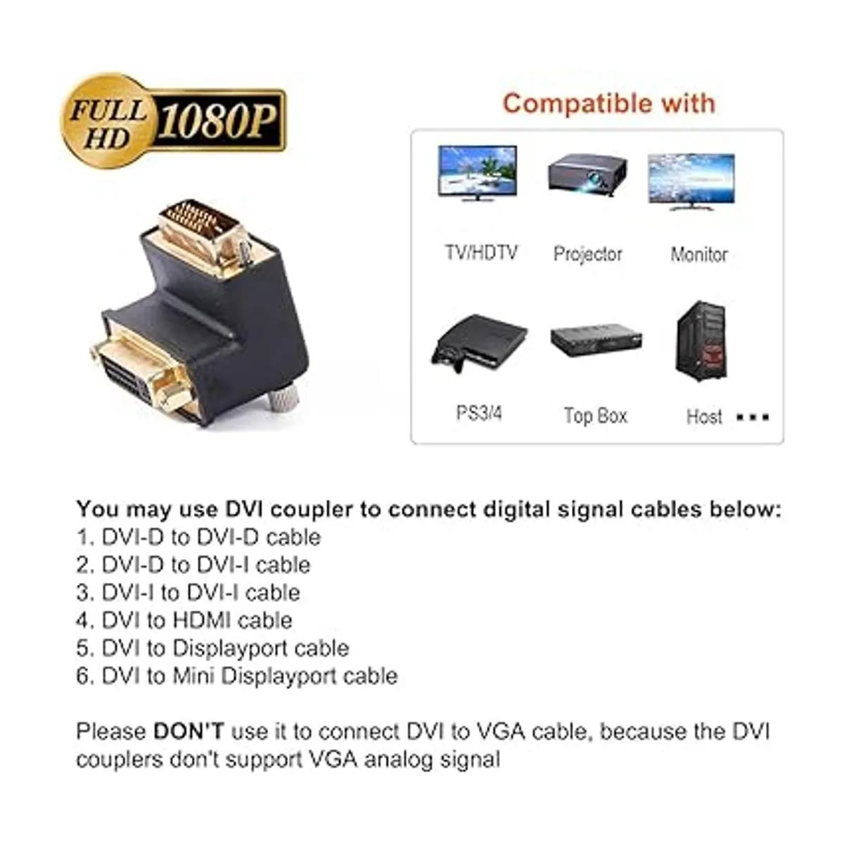 El conector de video adaptador pasivo DVI de 90 grados se puede utilizar para extender el cable DVI para computadora portátil, tarjeta gráfica, computadora de escritorio, monitor antiguo, pantalla de cine, televisor LCD, proyector, reproductor de Bluray, barra de fuego de caja de TV, consola de juegos PS3/PS4, etc.