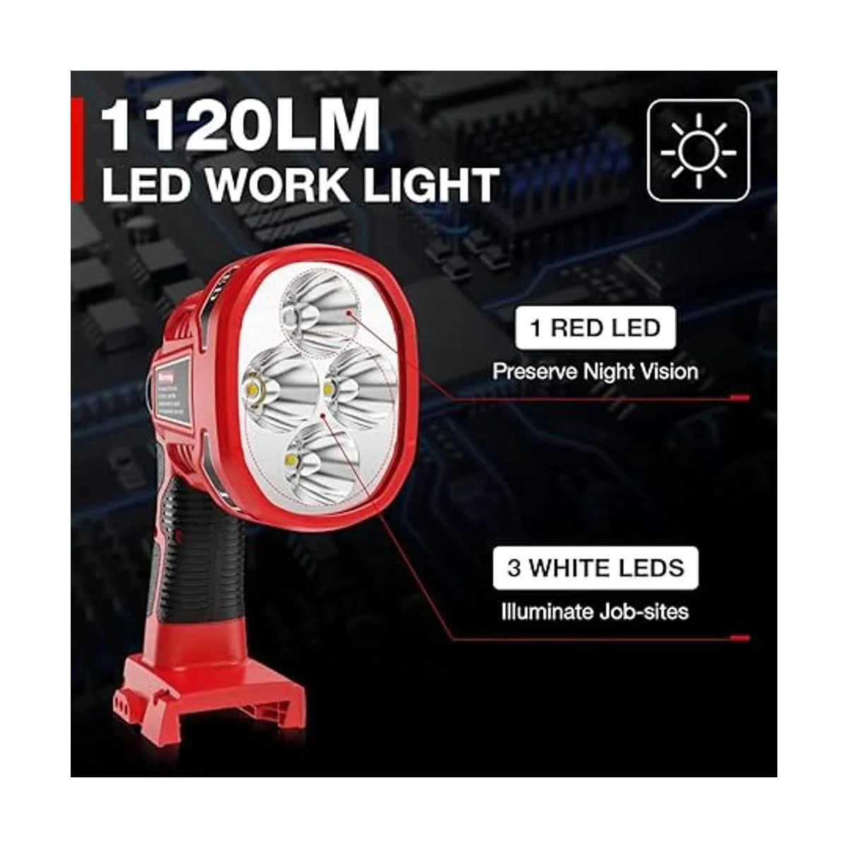 DTEZTECH Linterna de 12W 1120LM para batería de iones de litio Milwaukee 18V M18, luz inalámbrica M18 con luz de visión nocturna roja, puerto USB, cabezal giratorio de 110 grados