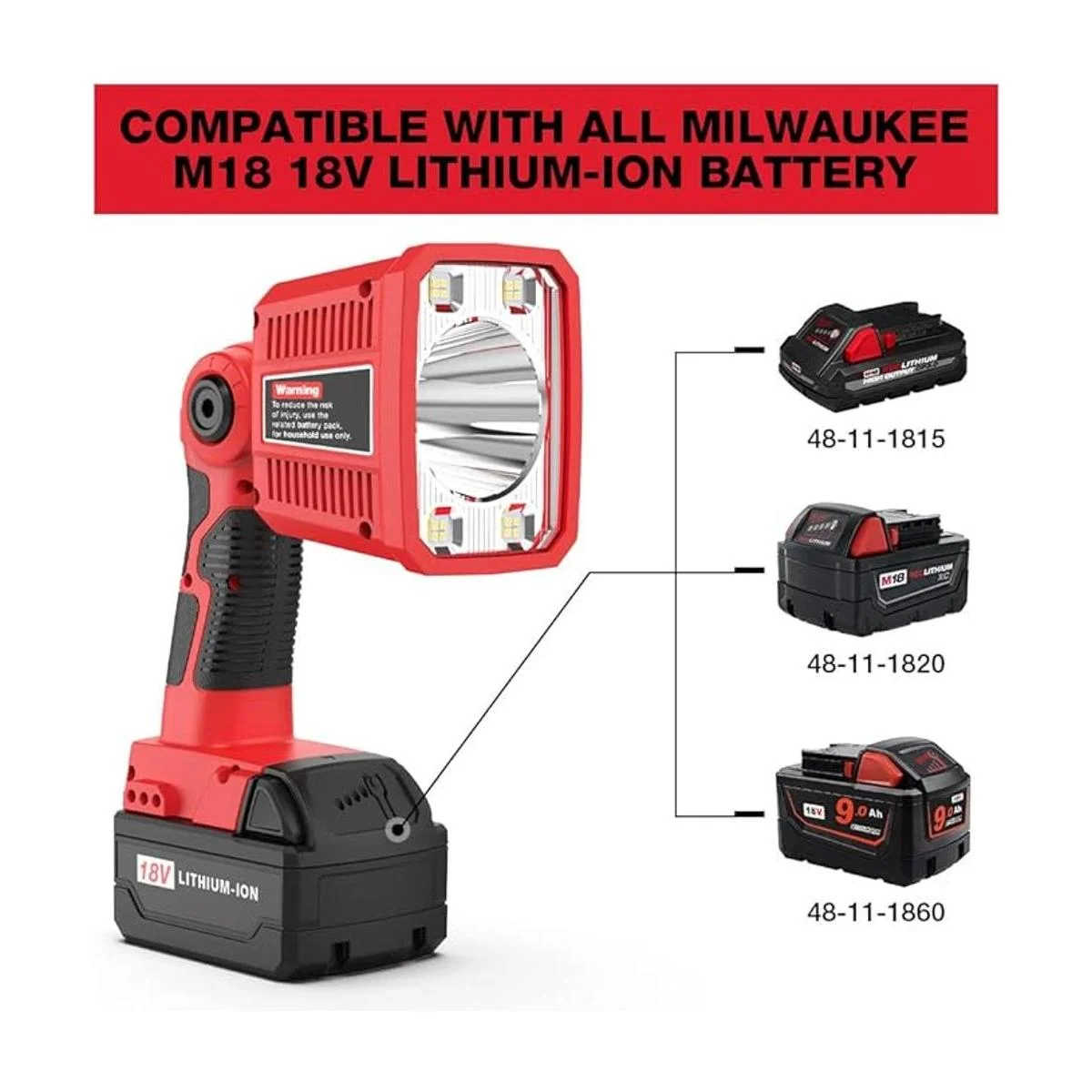 Alimentado por Milwaukee M18 Batería de iones de litio: actualiza para reemplazar Dewalt DCL050 DCL043, esta luz Milwaukee 100 compatible con baterías Milwaukee M18 de 18 V, 48111811, 48111815, 48111820, 48111111111111111111111111111111822, 48111828, 48111840, 48111841, 48111850, etc. No tienes que preocuparte por que sea compatible con tu batería de iones de litio Milwaukee, 100 compatible.