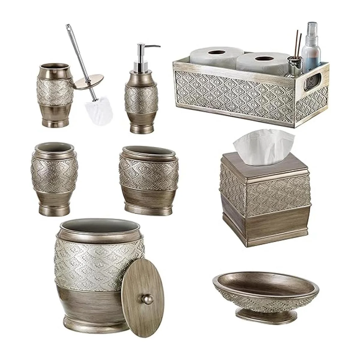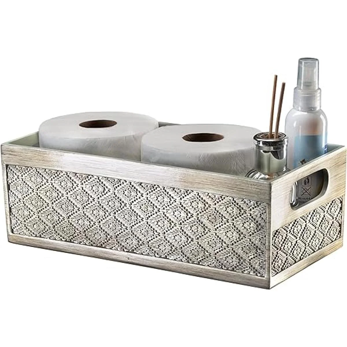 Diseñado para impresionar: los ricos tonos gris/plateados y los patrones texturizados de este organizador de baño sobre el inodoro crean una cesta rectangular de almacenamiento de papel higiénico.