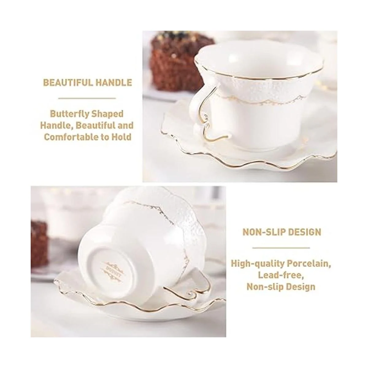 Nos preocupamos por cada detalle: este juego de tazas y platillos tiene un estante dorado, es muy fácil de sostener y almacenar. El hermoso mango en forma de mariposa también es el punto culminante del diseño de este juego. La parte inferior de las tazas y platos está esmerilada para evitar que se resbale de la mesa lisa. Es fácil de limpiar, se puede lavar a mano o en el lavavajillas.