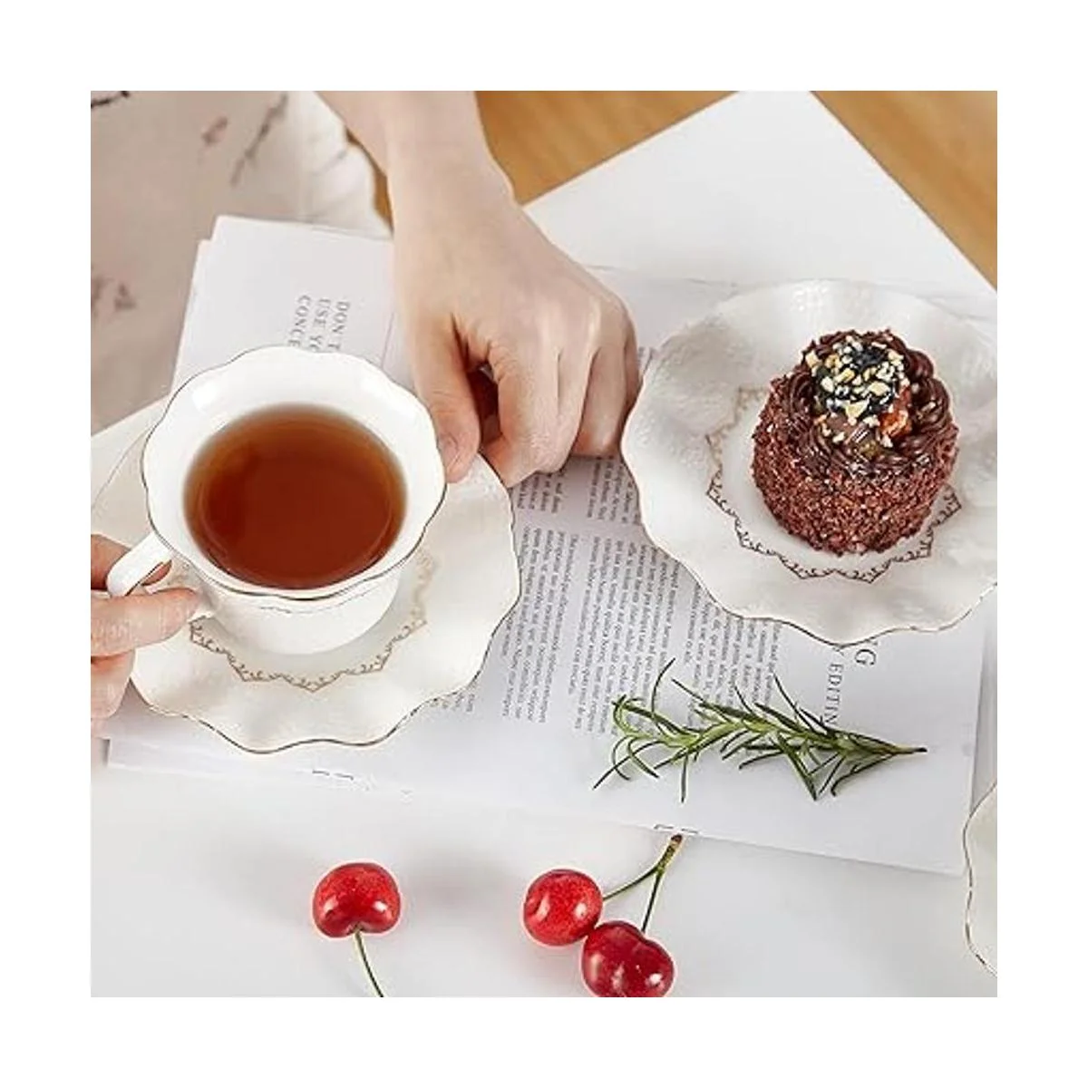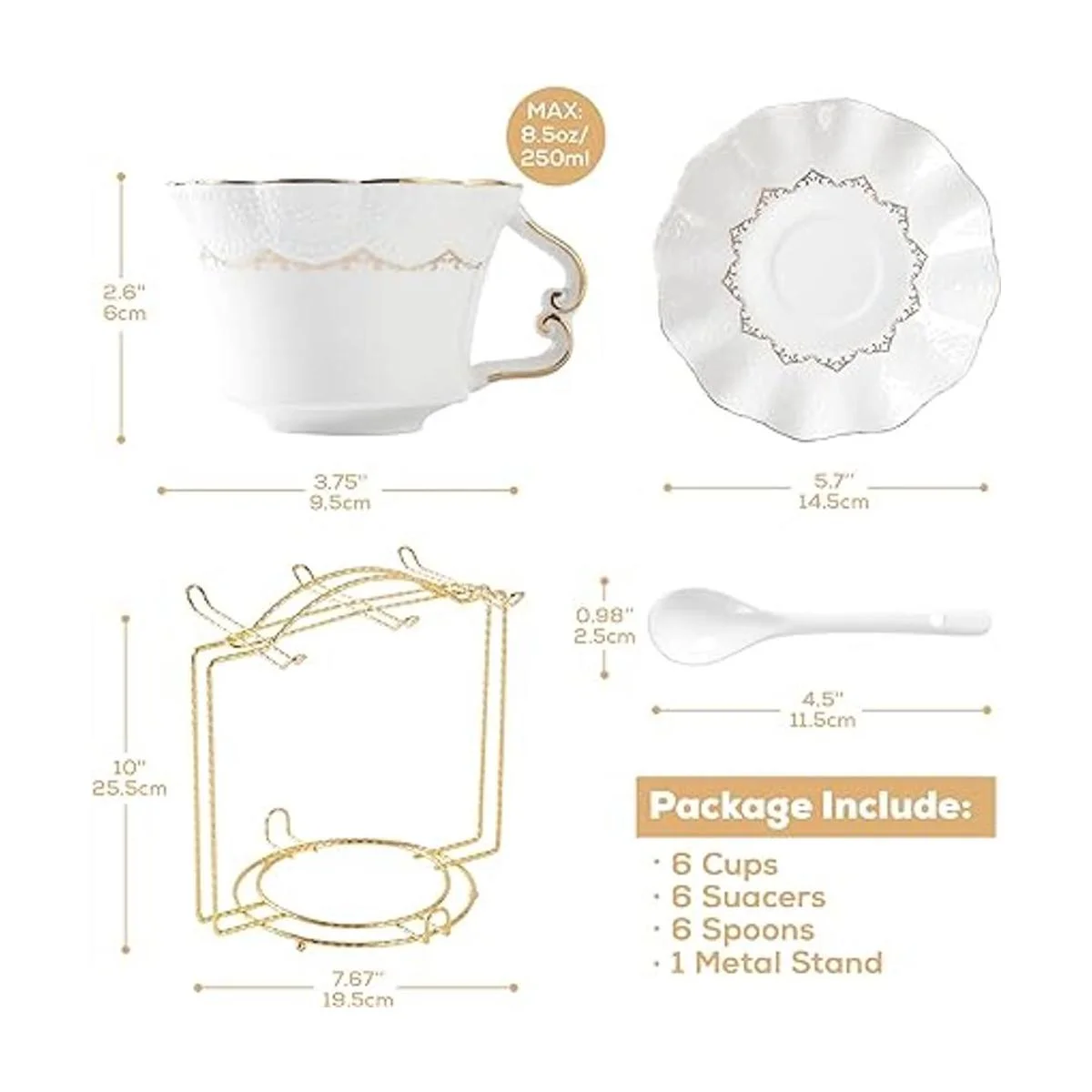 DUJUST Juego de 6 tazas de té y platillos 8.5 onzas, juego de tazas de té de lujo con borde dorado, tazas de café con impresión en relieve con soporte de metal, juego de fiesta de té de porcelana real británica, color blanco