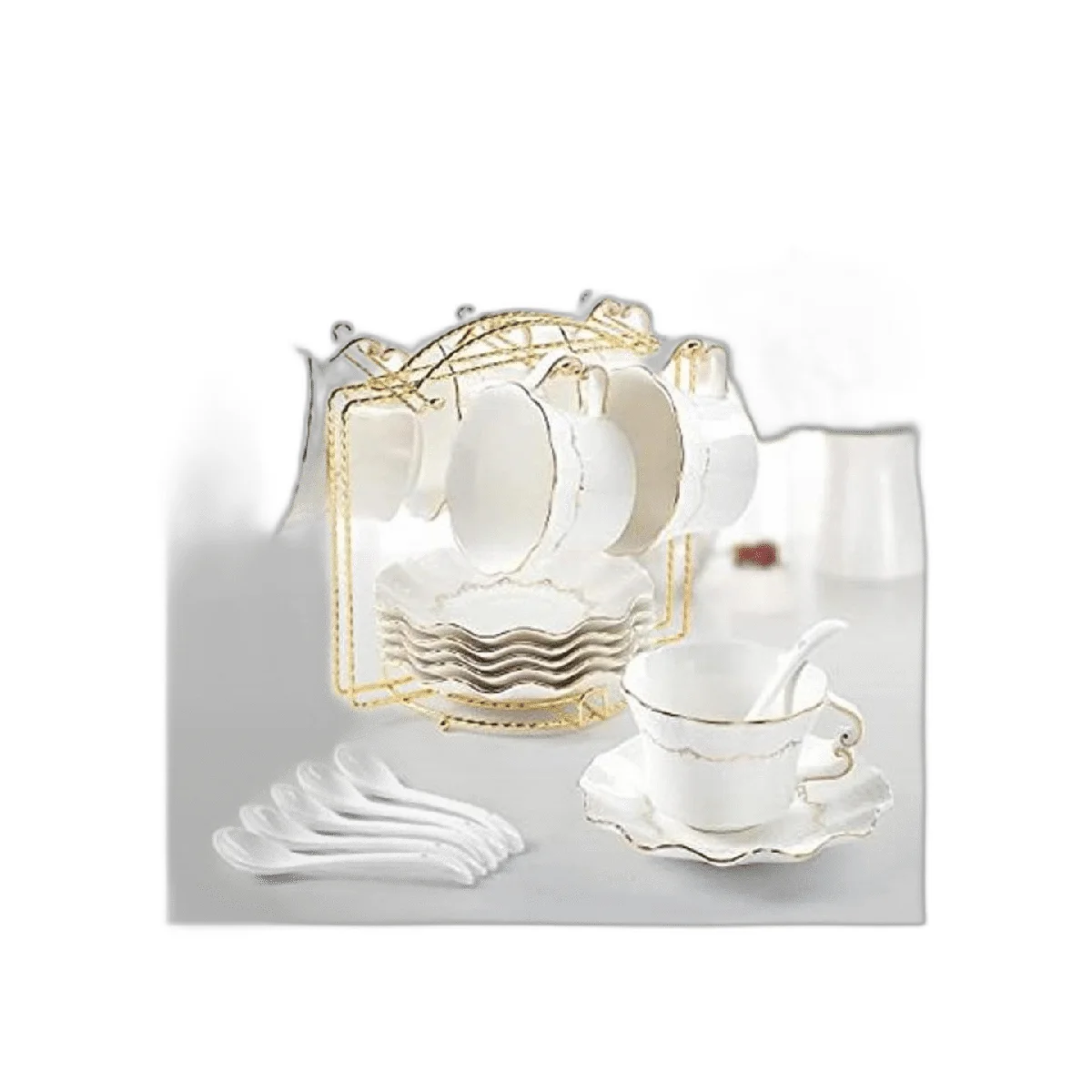 Juego de tazas reales británicas de lujo con forma de pétalo en oro: este hermoso juego de tazas y platillos viene con 6 tazas máx.: 8.5 fl oz, 6 platillos 5.7 pulgadas, 6 cucharas y un exquisito estante dorado. Diseño en forma de pétalo con ribete dorado, puede ser un gran juego de café o té para entretenimiento con tus amigos, una manera elegante de disfrutar de tu vida.