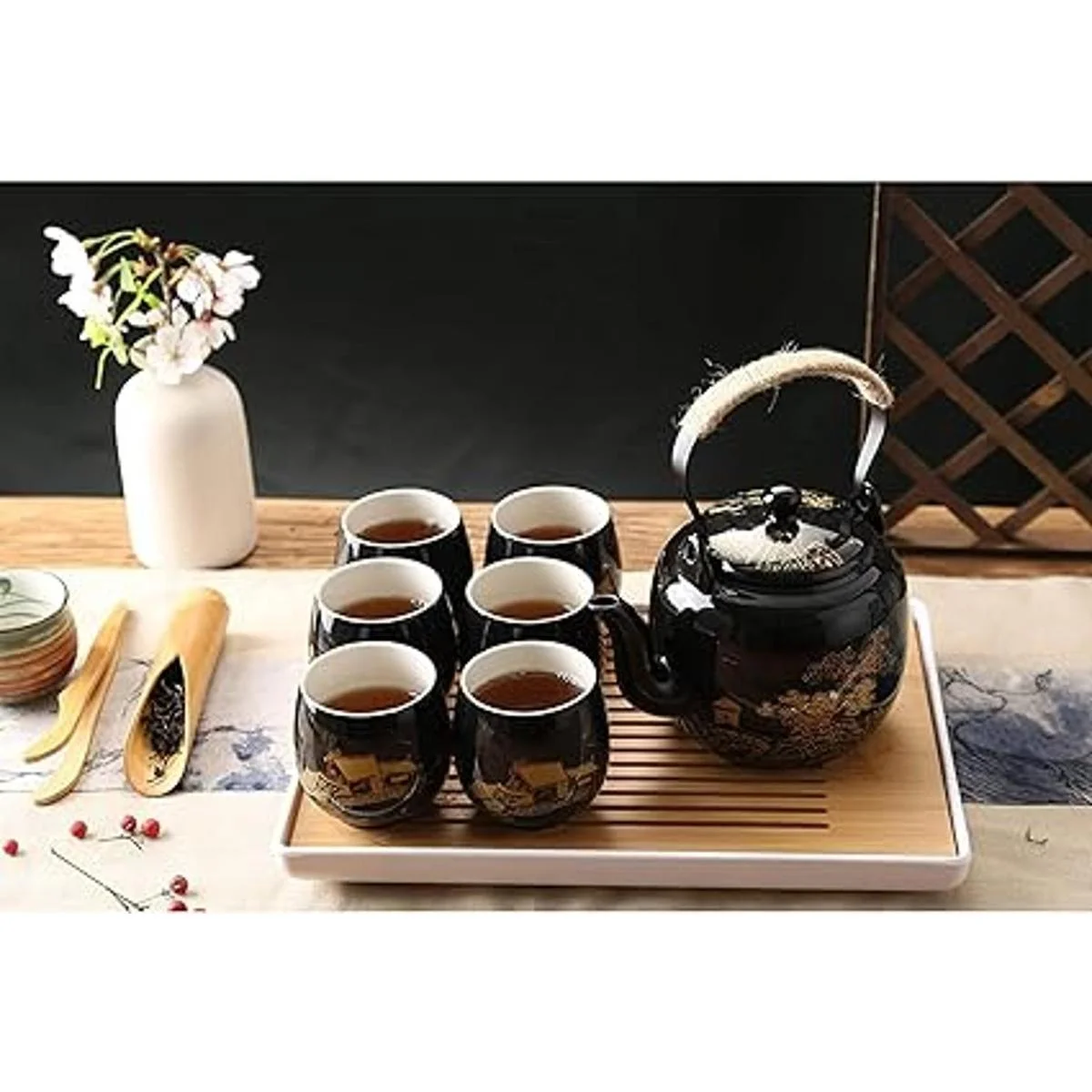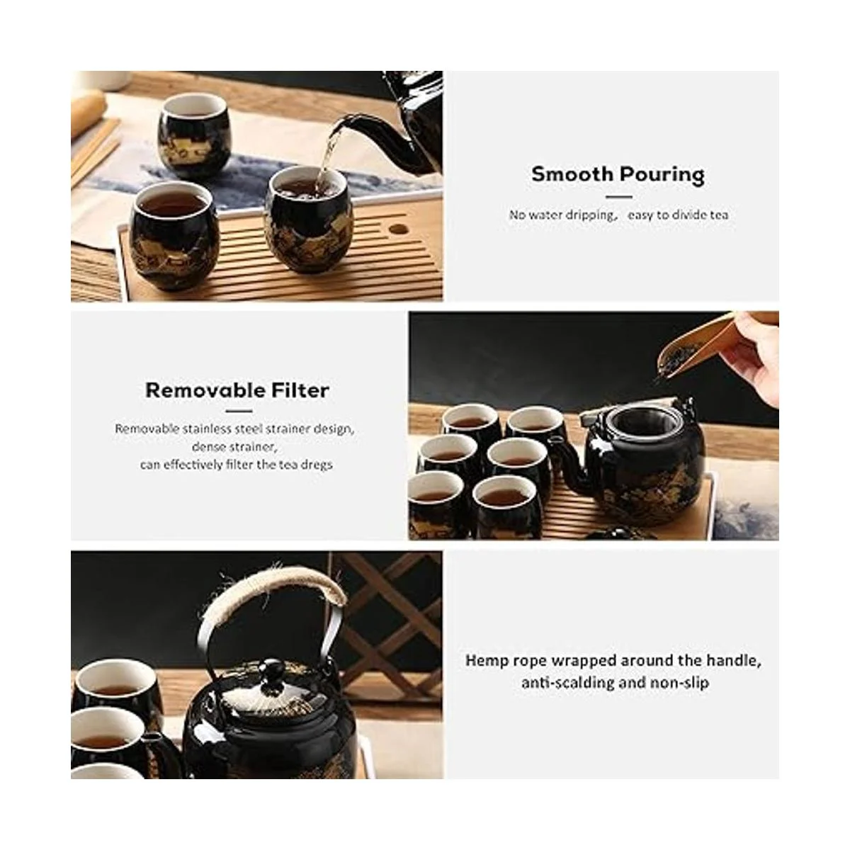 Dujust Juego de té japonés, juego de té de porcelana negra con 1 juego de tetera, 6 tazas de té, 1 bandeja de té, 1 infusor de acero inoxidable, hermoso juego de té asiático para adultos, amantes del témujereshombres campo en dorado