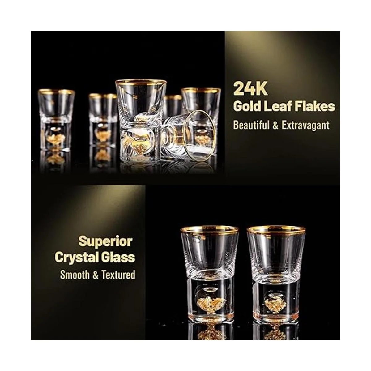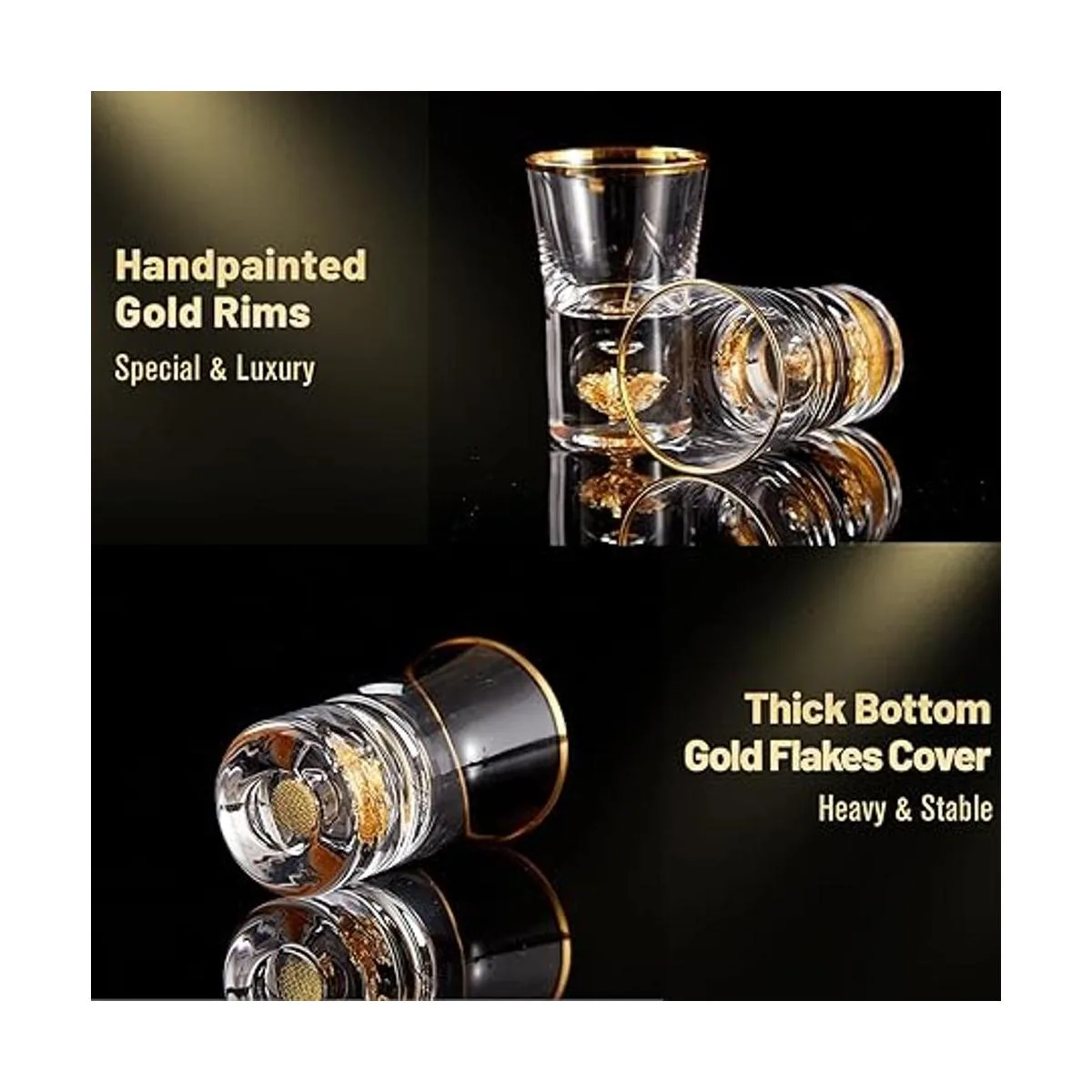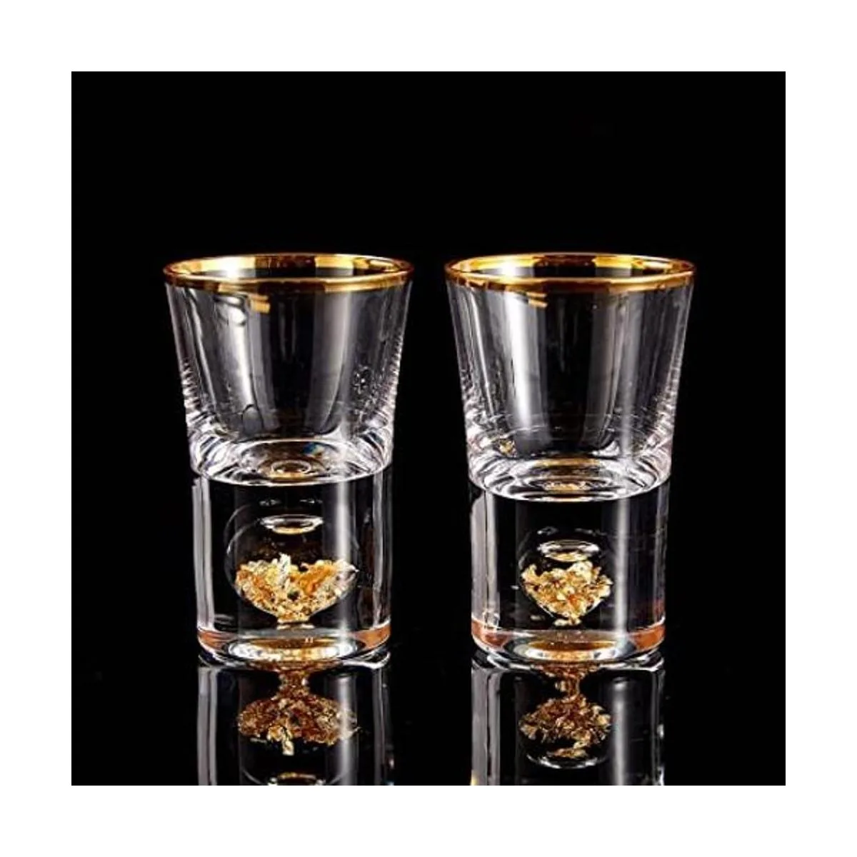 Copos de hoja de oro de 24 quilates, únicos: este juego de vasos de chupito está decorado con borde de oro de 24 quilates, y la parte inferior está rellena de lámina dorada, lujosa y hermosa. Los bordes dorados están hechos a mano por expertos artesanos, persiguiendo la perfección. El concepto de diseño de este juego es ser único y extravagante.