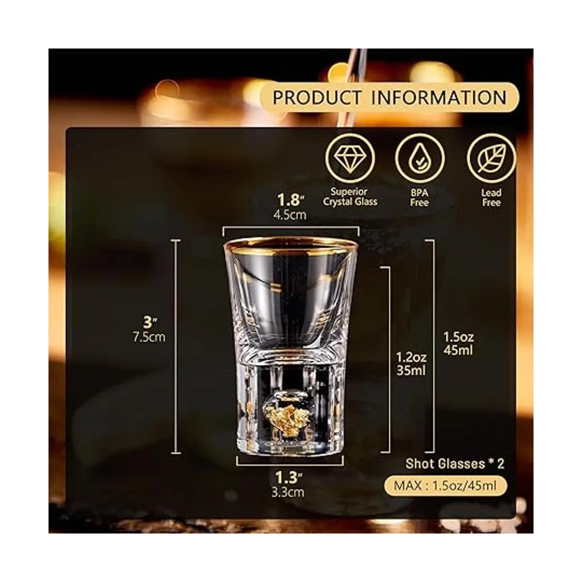 DUJUST Vasos de chupito 1.5 oz, juego de vidrio de cristal decorado con copos de hojas doradas de 24 quilates, vasos geniales y bonitos, sin BPA y sin plomo, perfectos para decoración y colección, opciones de regalo, 2 piezas