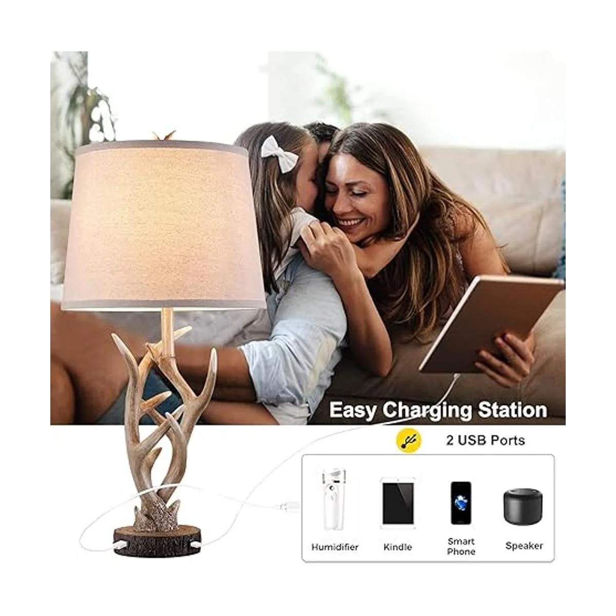 Juego de lámparas de mesa USB rústicas: cada lámpara de mesa de granja para sala de estar contiene dos puertos de carga USB de 5 V/2 A en la base de luz, muy fácil de cargar tu dispositivo eléctrico como teléfono celular, lectores Kindle, tabletas, portátiles mientras estás acostado en tu cama o sofá. Los puertos USB funcionan independientemente de si la lámpara está encendida o apagada, es práctica y ornamental.