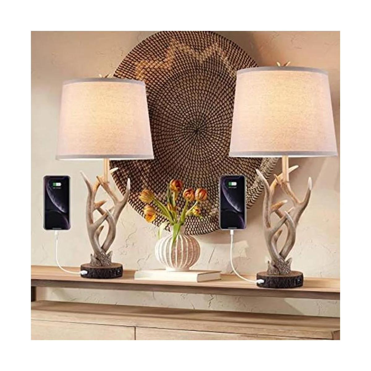 Dungoo Juego de 2 lámparas de mesa rústicas occidentales de 26 pulgadas para dormitorio con 2 puertos USB, lámpara de mesa de cuernos naturales para sala de estar, vestíbulo, oficina marrón rústico
