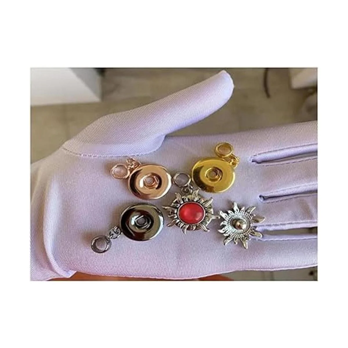 4. Adecuado: estos sencillos accesorios se pueden intercambiar con tus decoraciones favoritas, diseñar y hacer tus propias manualidades creativas, colgantes, pulseras, collares, pendientes, joyas, etc. Regala un regalo especial a amigos y familiares. Comprueba el tamaño del botón para adaptarse mejor a tu proyecto