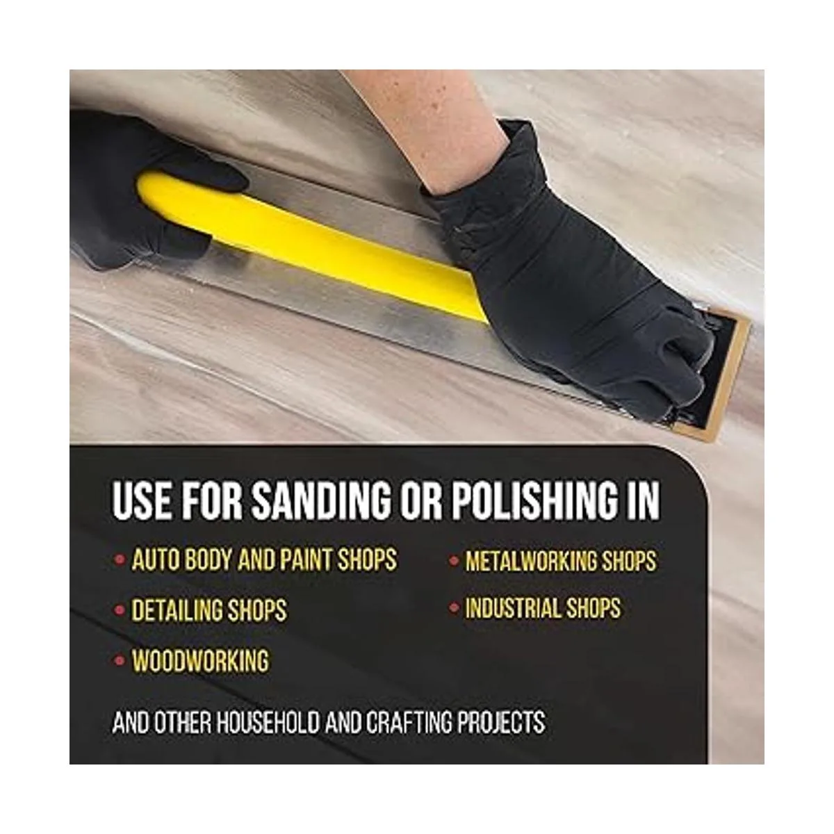 Un versátil bloque de lijado a mano para uso de lijado o pulido en talleres de carrocería y pintura, tiendas de detalles, fabricación de muebles de madera, talleres de metal, tiendas industriales, yeso y otros proyectos domésticos y de manualidades.