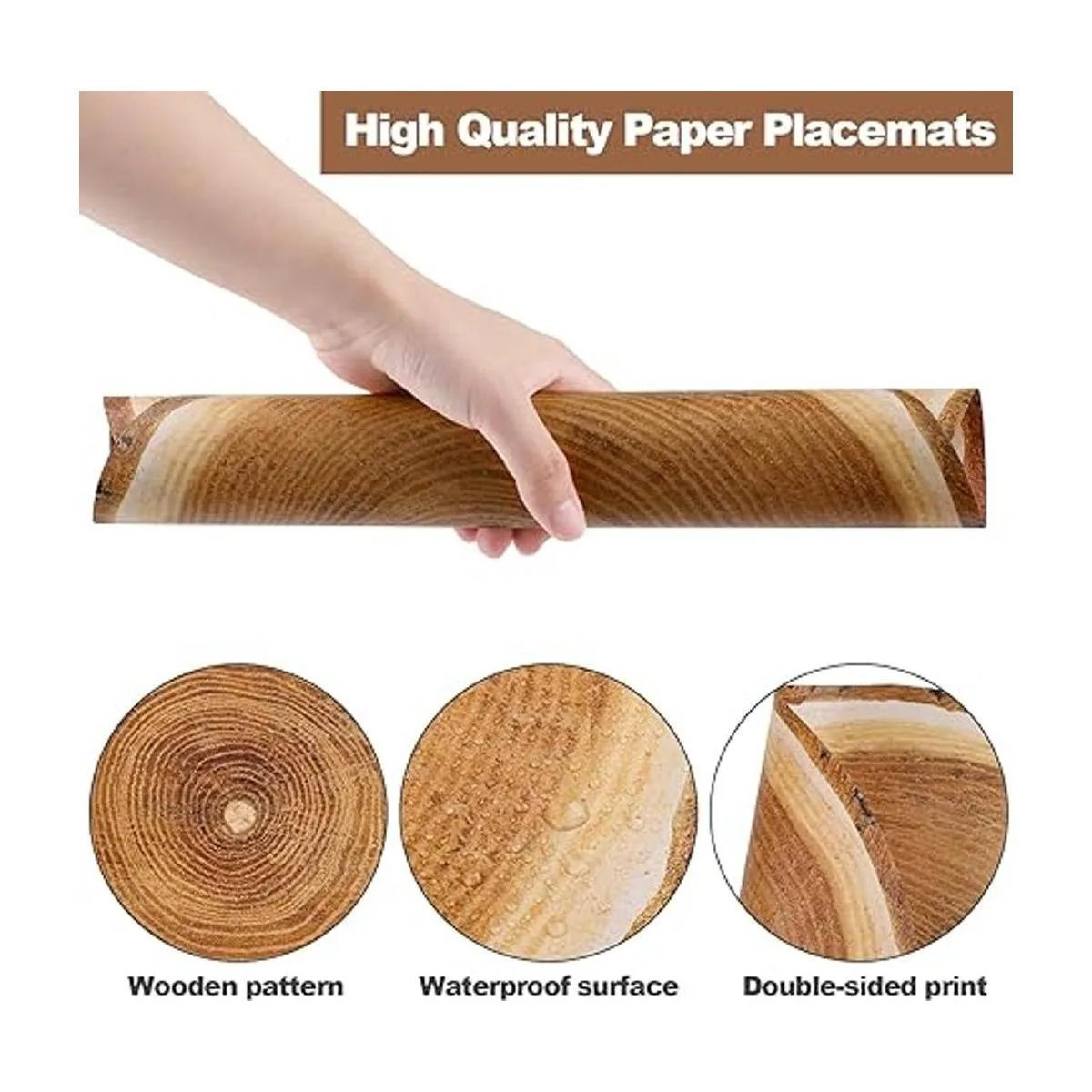 Papel impermeable: nuestros manteles individuales de madera rústica están hechos de papel de alta calidad, y sus superficies han sido tratadas para impermeabilidad; por lo tanto, estos manteles individuales no se mojarán con agua u otros líquidos; puedes sentirte libre de usarlos para tu fiesta