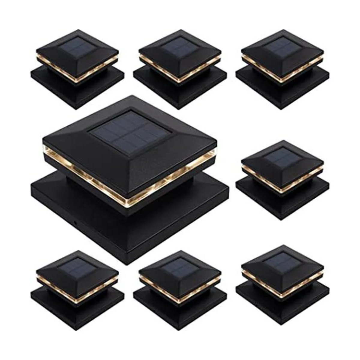 Dynaming Paquete de 8 luces solares para postes de luz decorativa para exteriores, tapas de carcasa negra alimentadas por energía solar, iluminación LED SMD blanca cálida de alto brillo para vallas, terraza, patio, para postes de madera de 4 x 4, 5 x 5 o 6 x 6 pulgadas