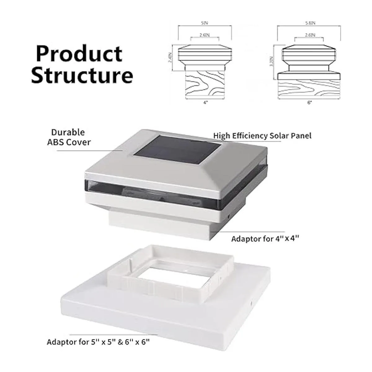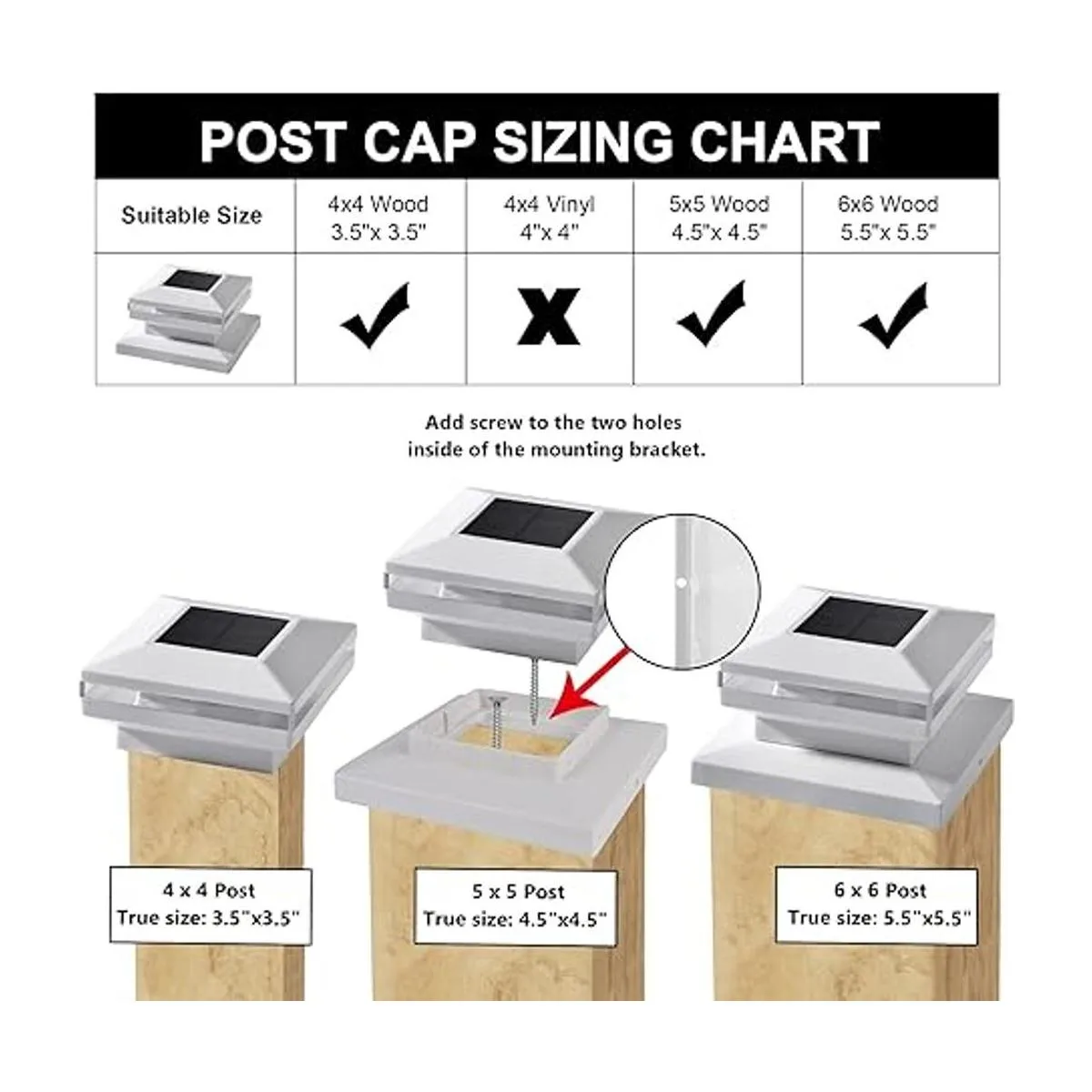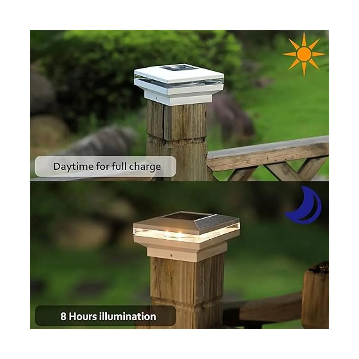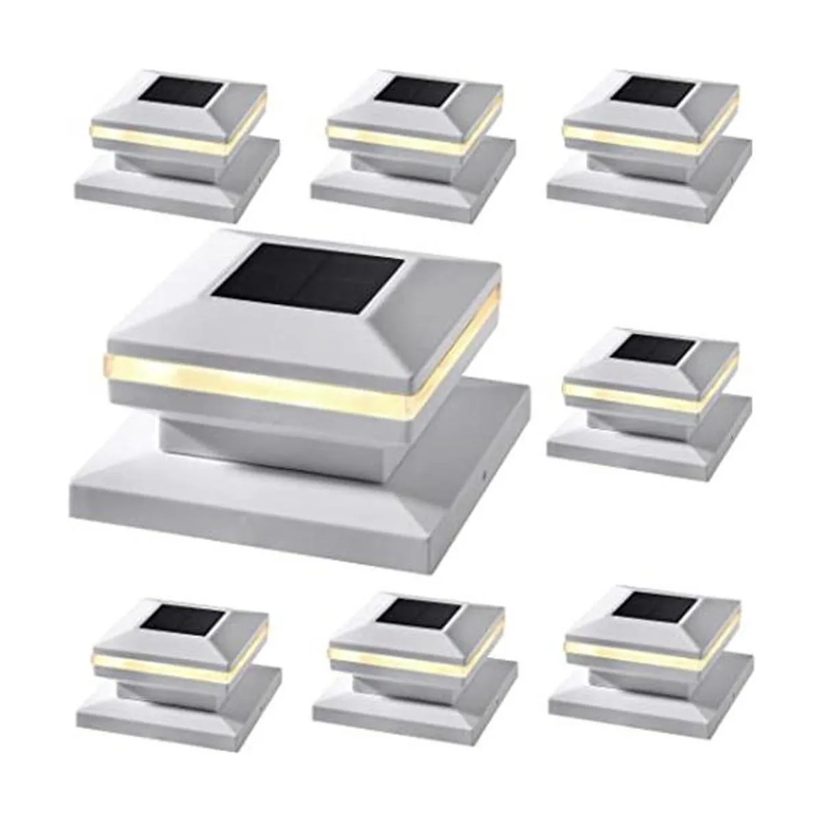 Dynaming Paquete de 8 luces solares para postes, luces decorativas para exteriores, tapas de carcasa blanca alimentadas por energía solar, iluminación LED SMD blanca cálida de alto brillo para valla de terraza, patio, apto para postes de madera de 4 x 4, 5 x 5 o 6 x 6 pulgadas