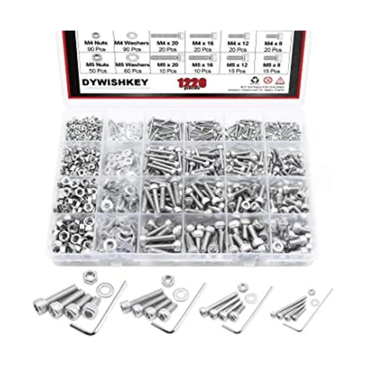 DYWISHKEY 1220 piezas M2 M3 M4 M5, 304 de acero inoxidable hexagonal, tornillos, tuercas, arandelas, kit surtido con llaves hexagonales