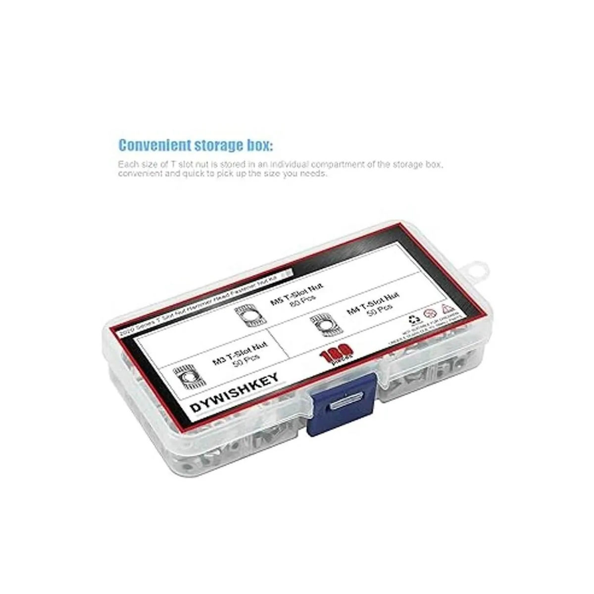 El paquete incluye: 3 tamaños diferentes de tuercas en T empaquetadas en una caja de plástico transparente duradera, 50 piezas M3, 50 piezas M4, 80 piezas M5, 180 piezas en total, satisface tus diferentes necesidades.