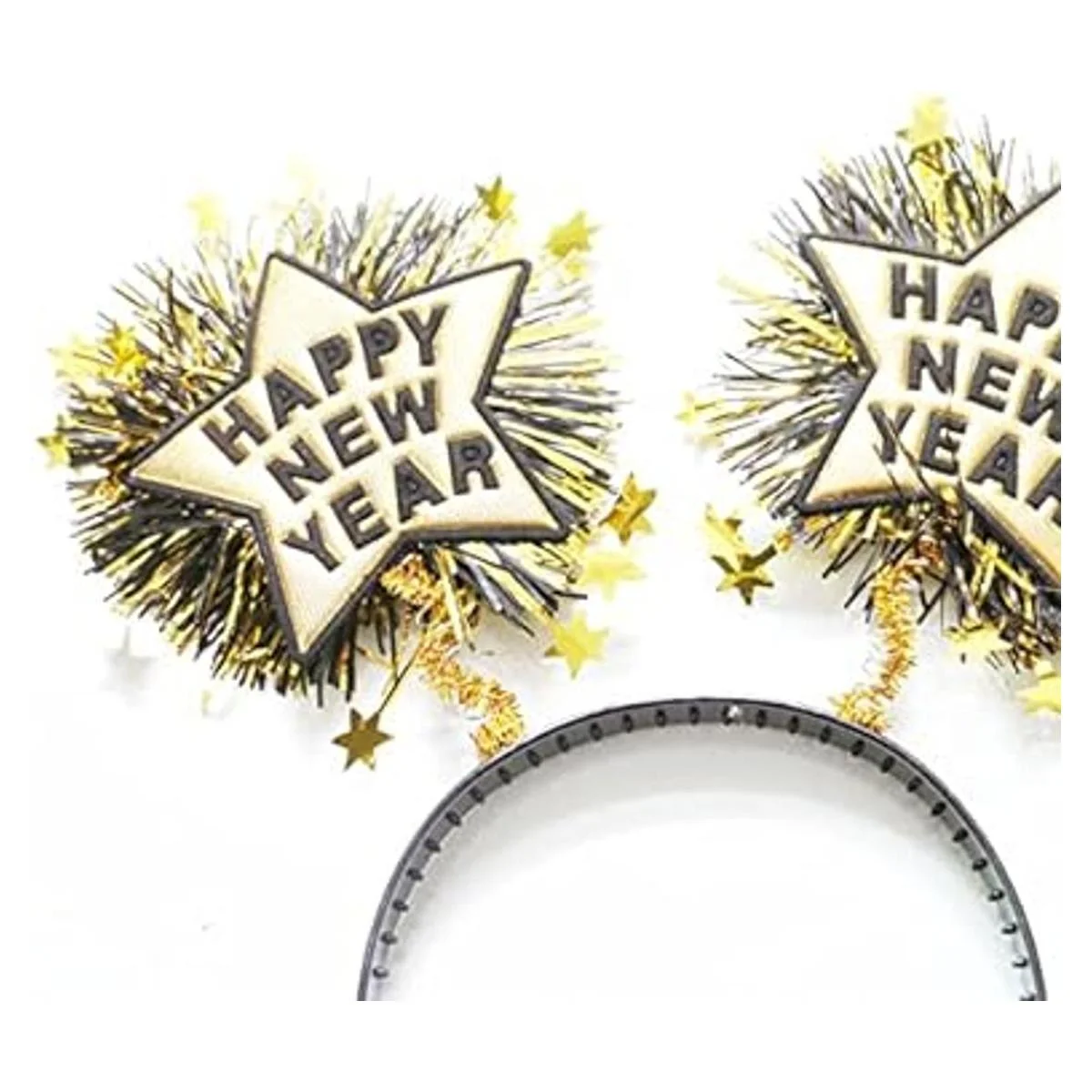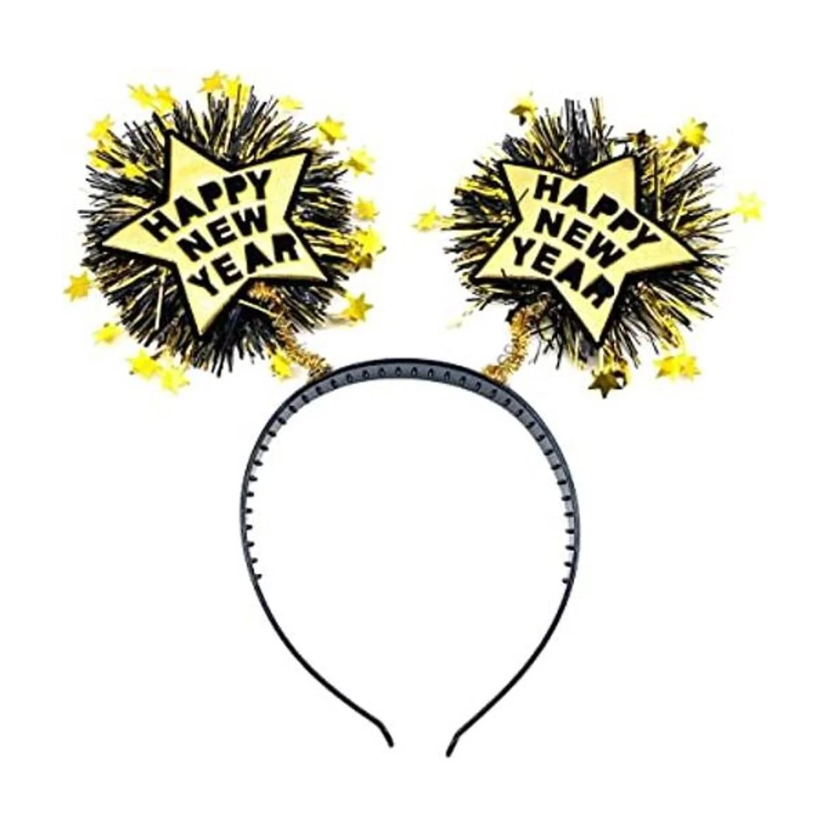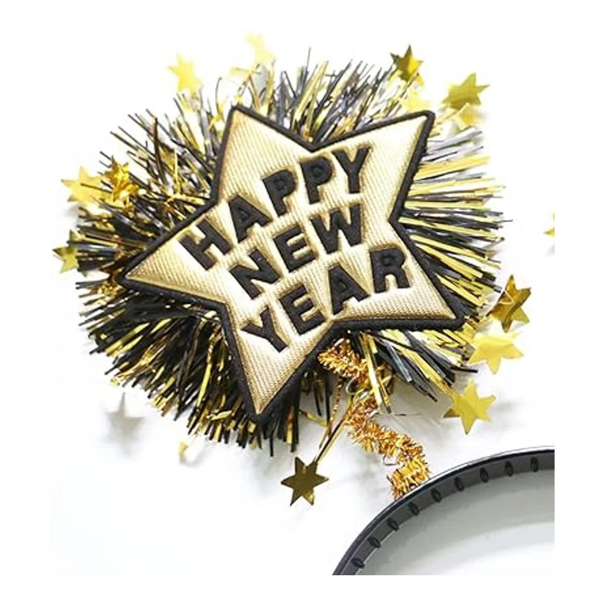 El paquete incluye: 1 diadema de feliz año nuevo con broches de estrella y oropel dorado.