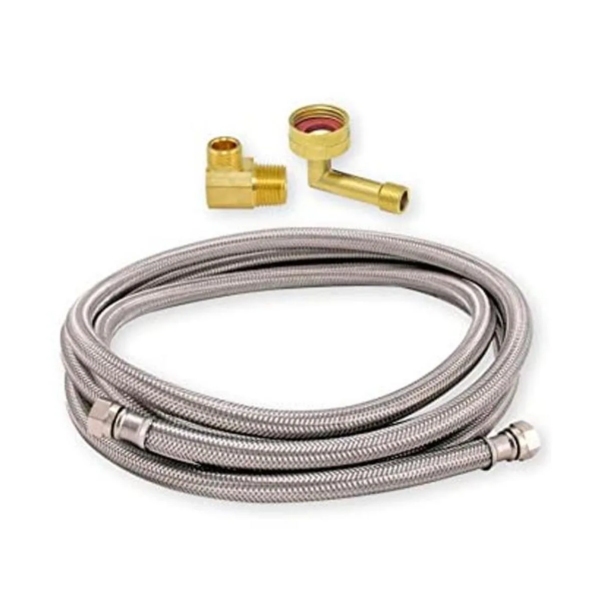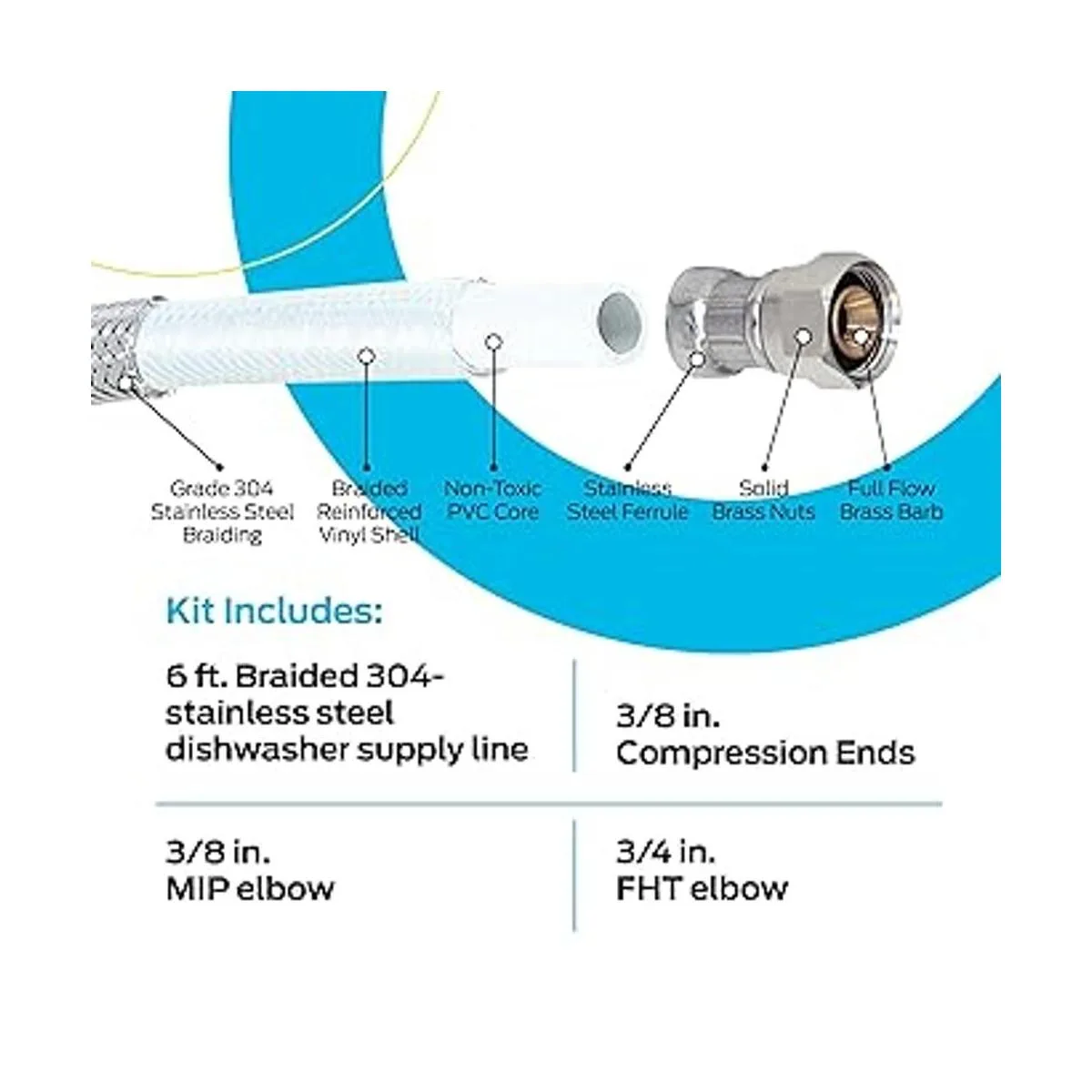 Qué incluye: 1 línea de suministro de lavavajillas de acero inoxidable 304 trenzado de 8 pies, 1 codo MIP de 3/8 pulgadas y 1 codo FHT de 3/4 pulgadas