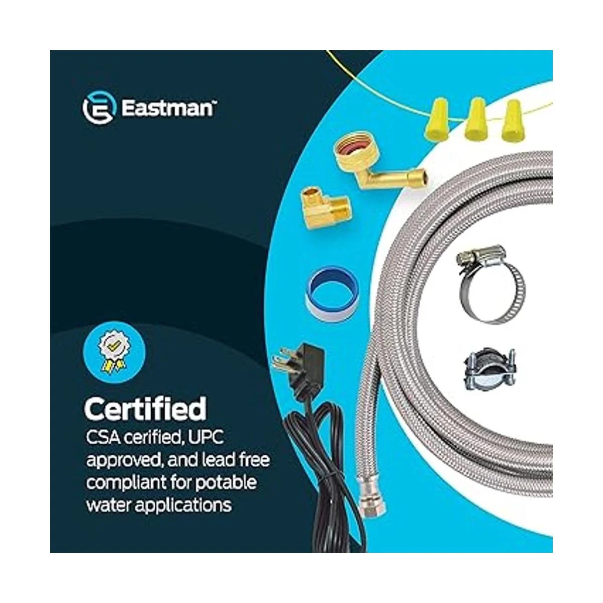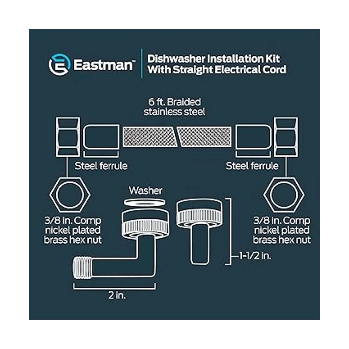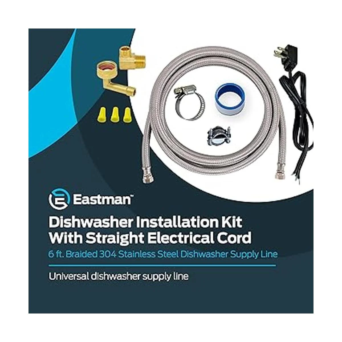 Eastman Kit de instalación de lavavajillas con cable eléctrico recto, compresión de 34 pulgadas, codo MIP de 38 pulgadas, codo FHT de 34 pulgadas, conectores de lavavajillas de acero inoxidable trenzados de 6 pies, 41150