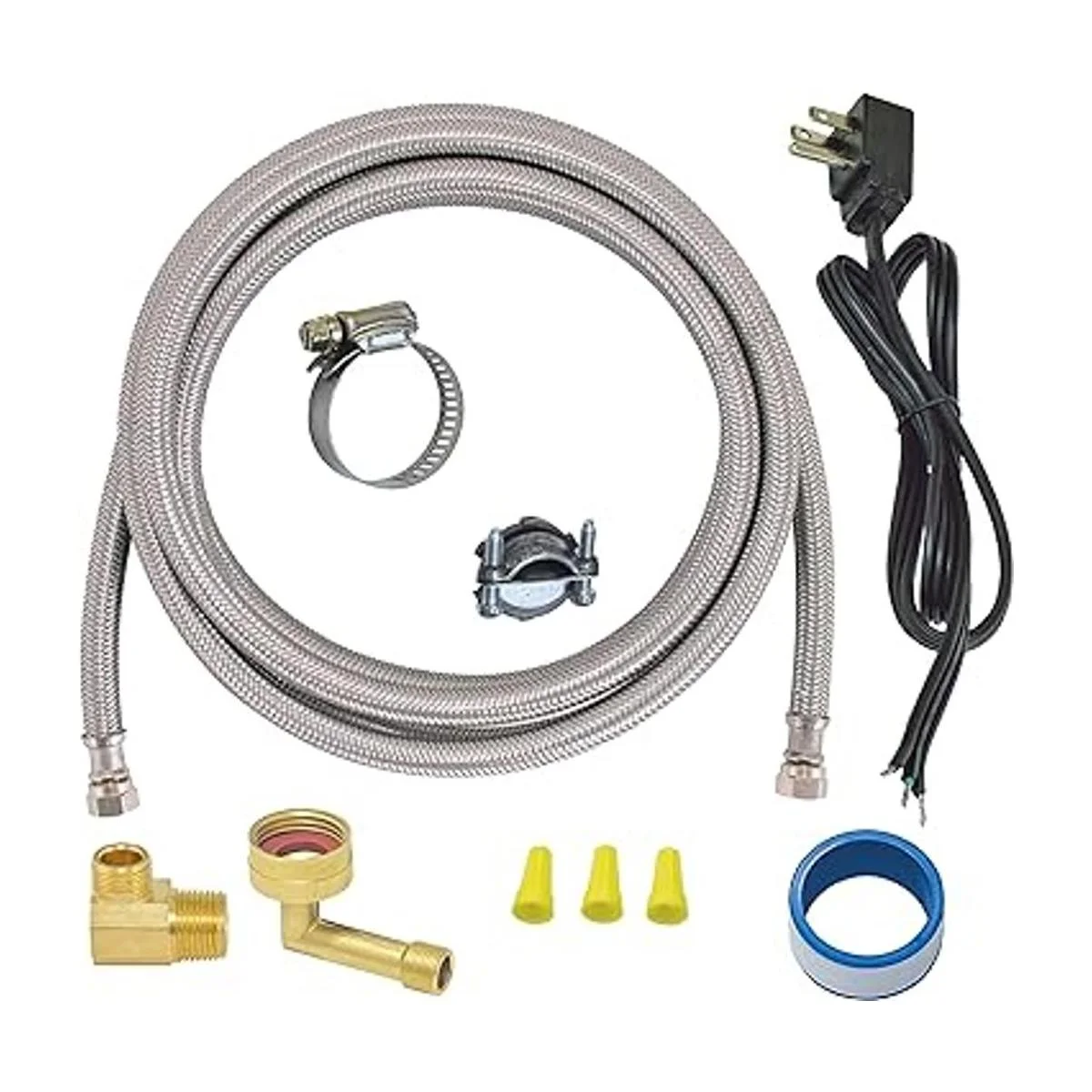 Qué incluye: el kit de montaje para lavavajillas incluye 1 línea de suministro de lavavajillas de acero inoxidable de 6 pies de largo, 1 cable de alimentación recto de 3 clavijas de 6 pies de largo, 1 codo MIP de 3/8 pulgadas, 1 codo FHT de 3/4 pulgadas, 3 tuercas de alambre, 1 cinta de teflón, 1 abrazadera de manguera de acero inoxidable y 1 conector Romex