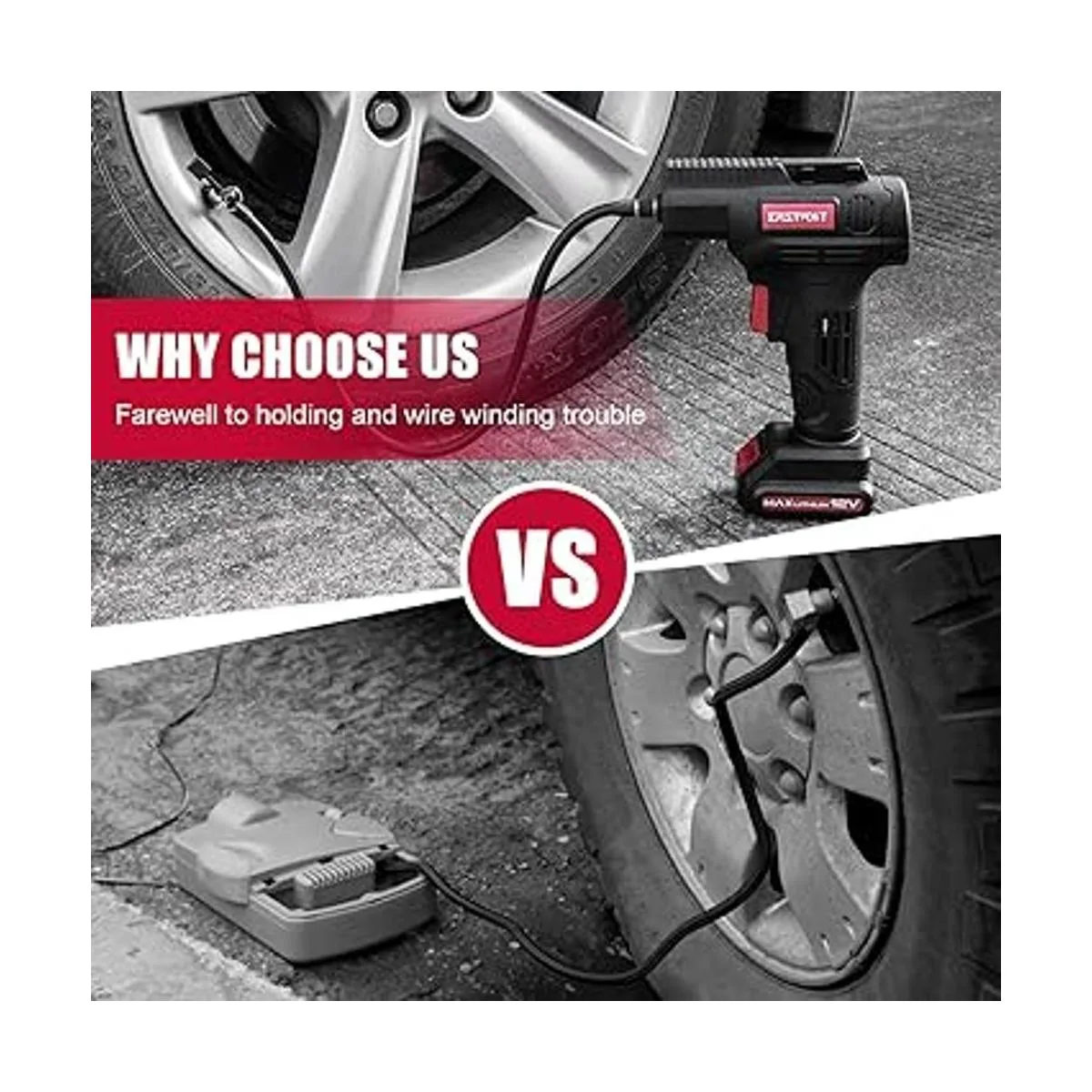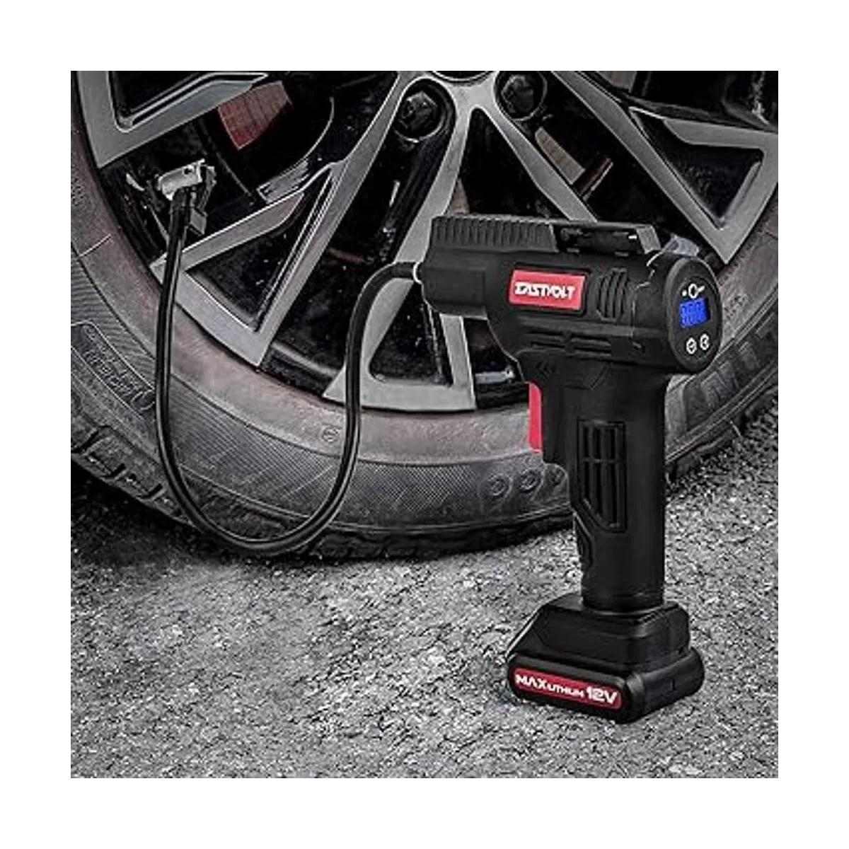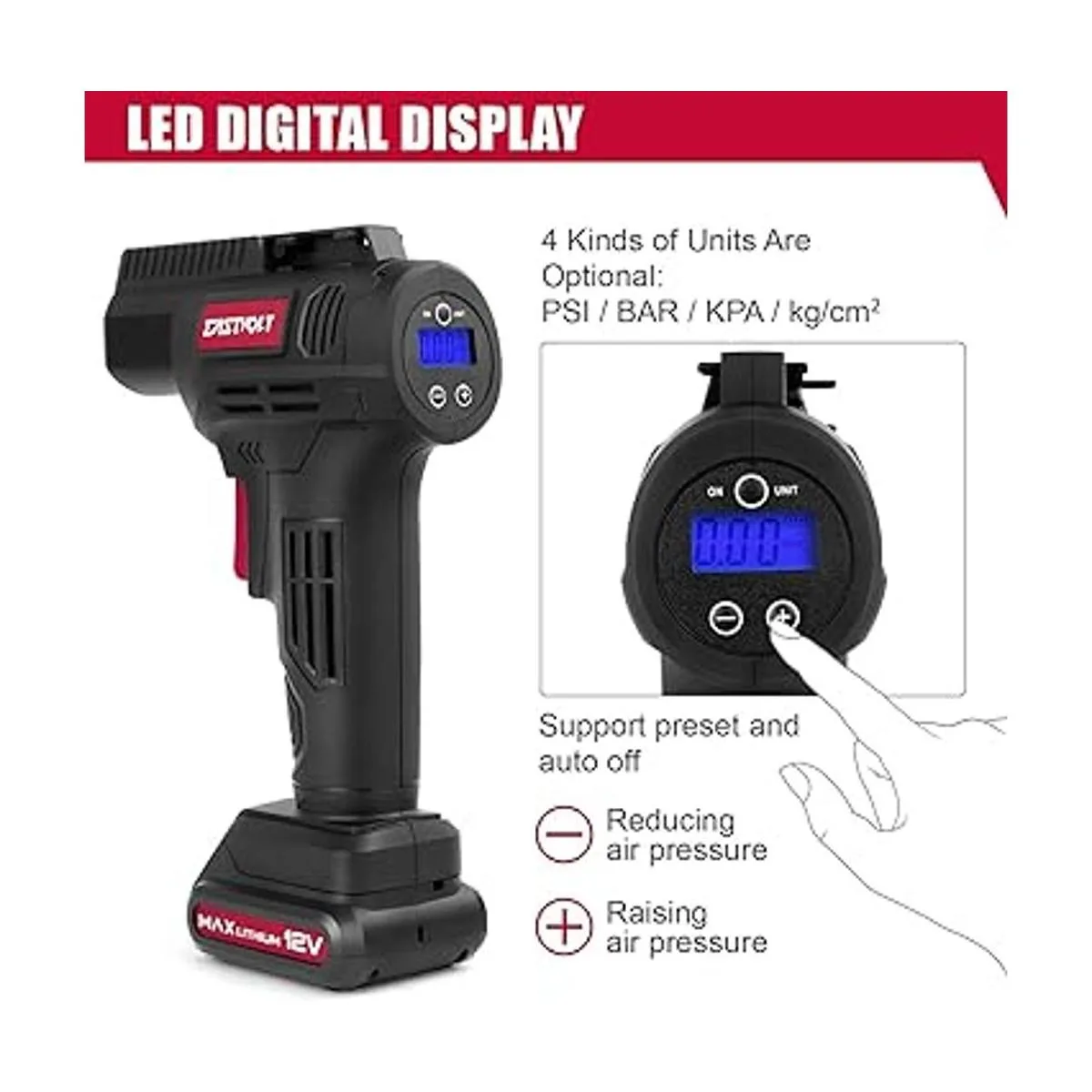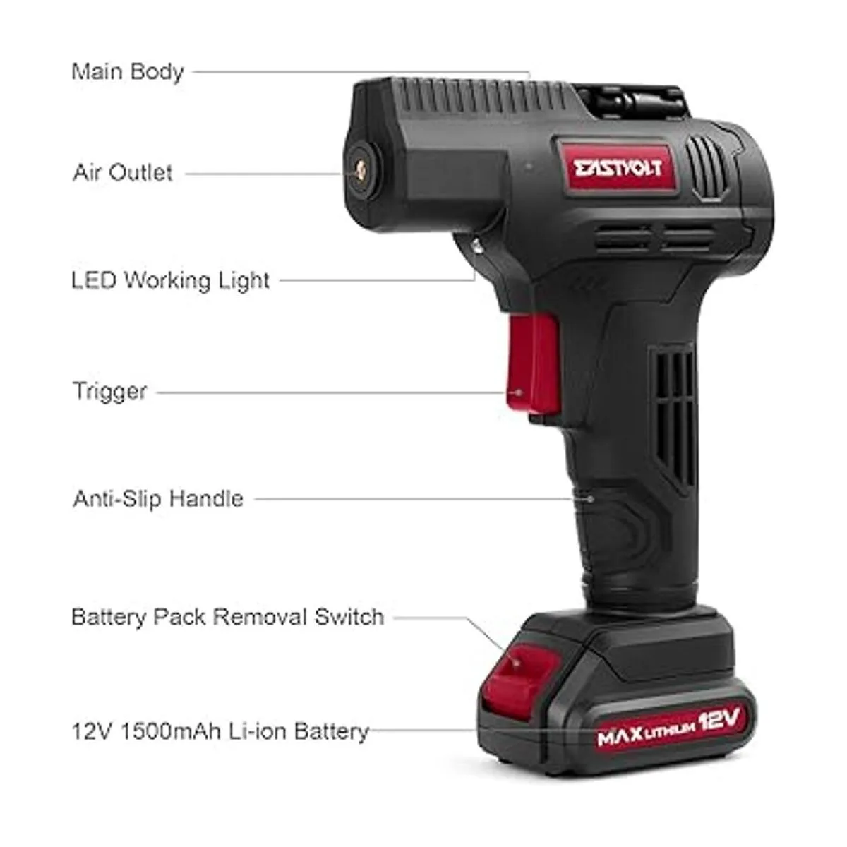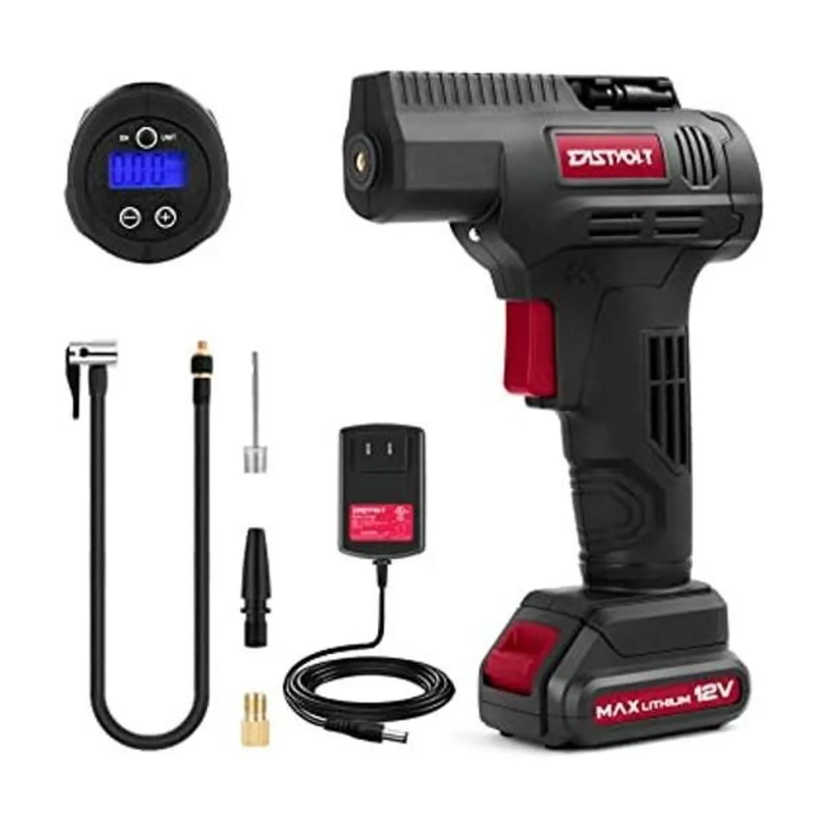 Eastvolt Compresor de aire inflador de neumáticos de 12 V, potencia eléctrica multiusos, máximo 150 PSI con medidor de 4 unidades, 3 boquillas, cargador rápido y batería recargable de 1.5 Ah
