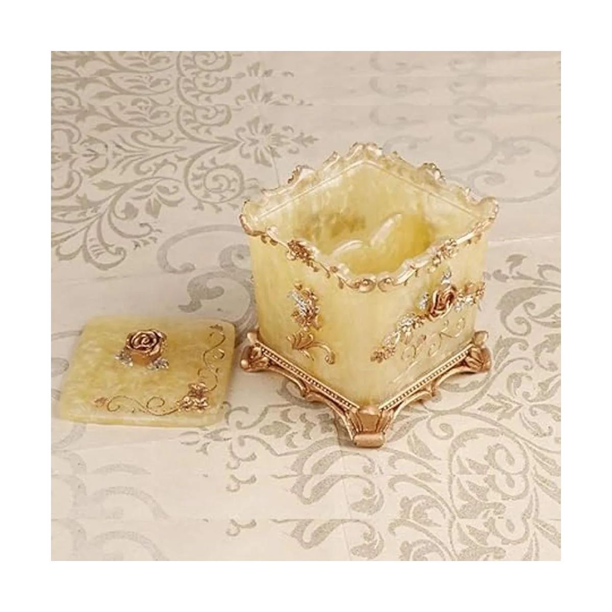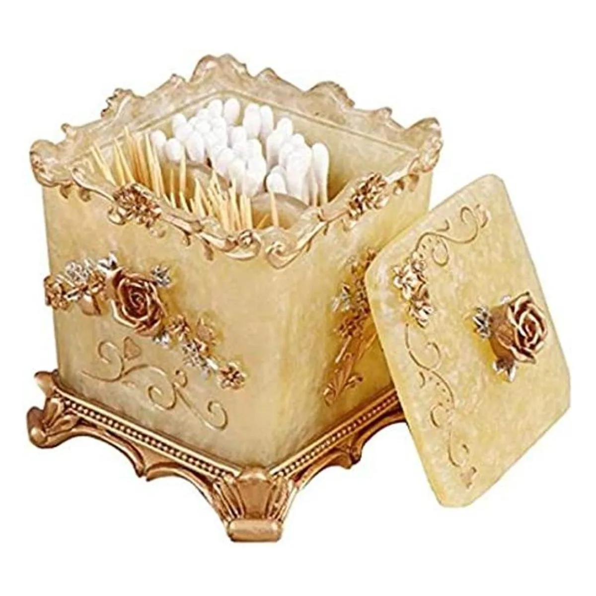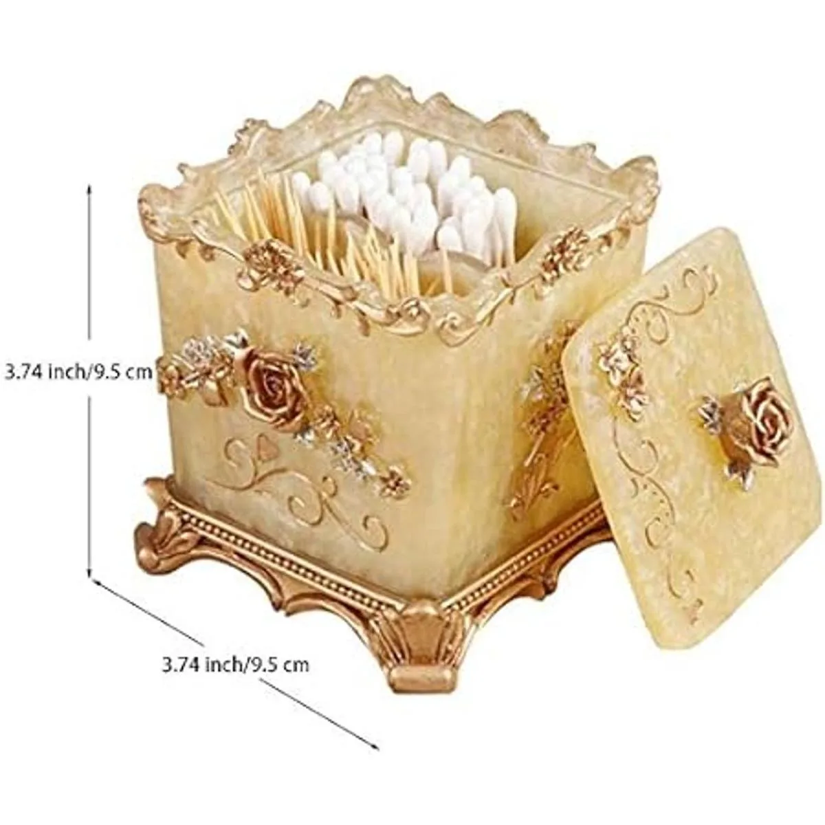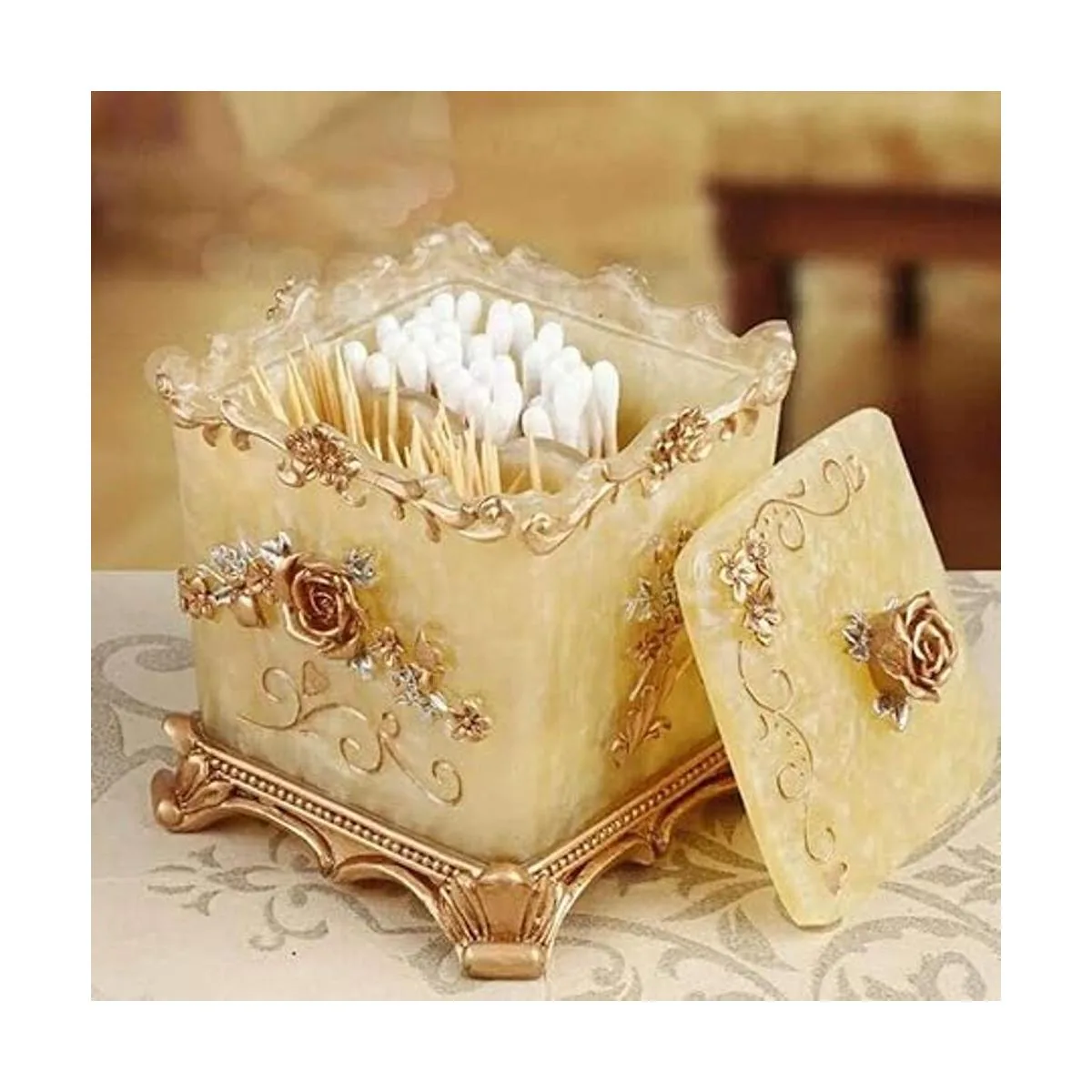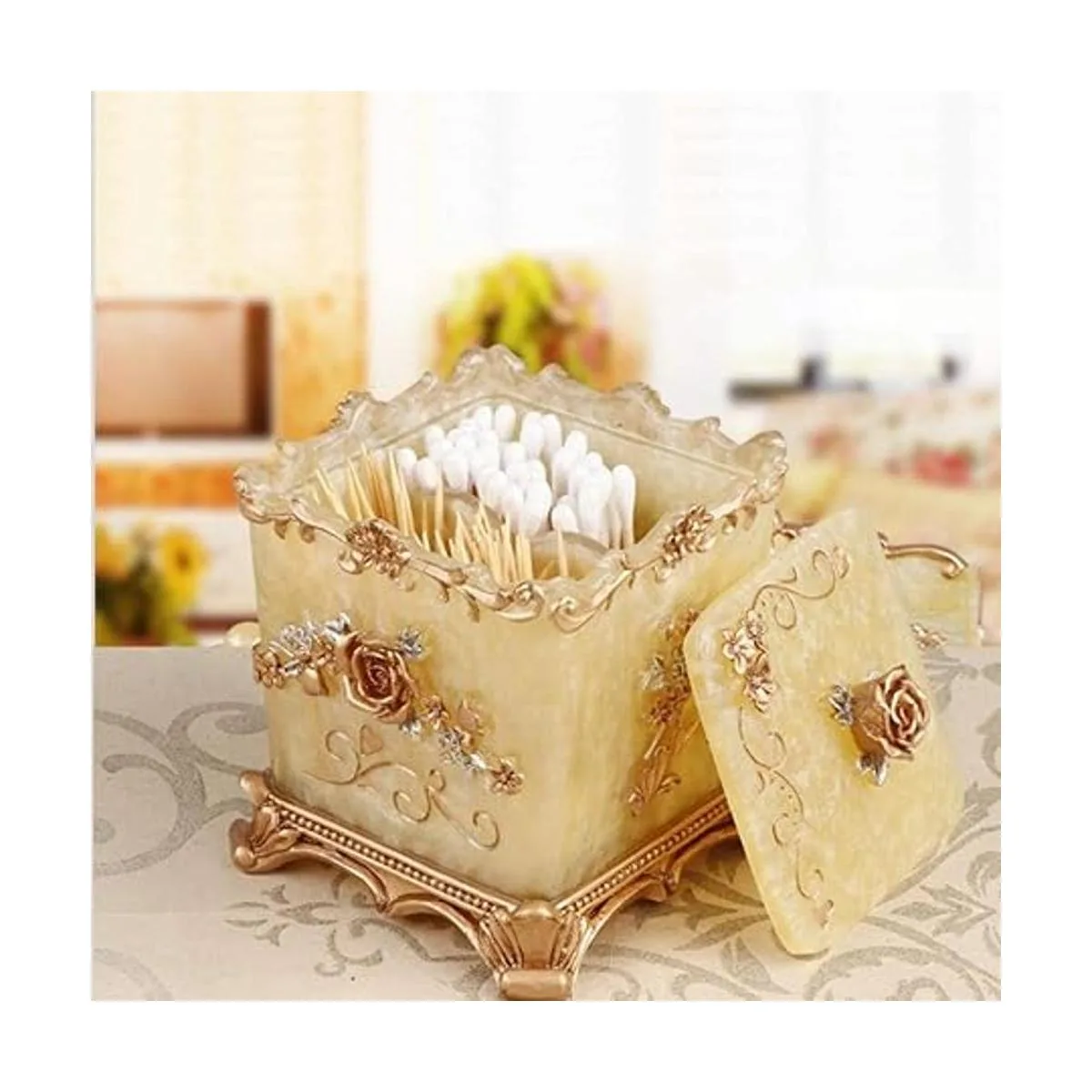 Color: no es de color rojo o plateado, sino oro amarillo, muy adecuado para usar en armarios de baño, salones, restaurantes y ocasiones de alta gama, un recipiente para hisopos de algodón y soporte para bastoncillos de baño