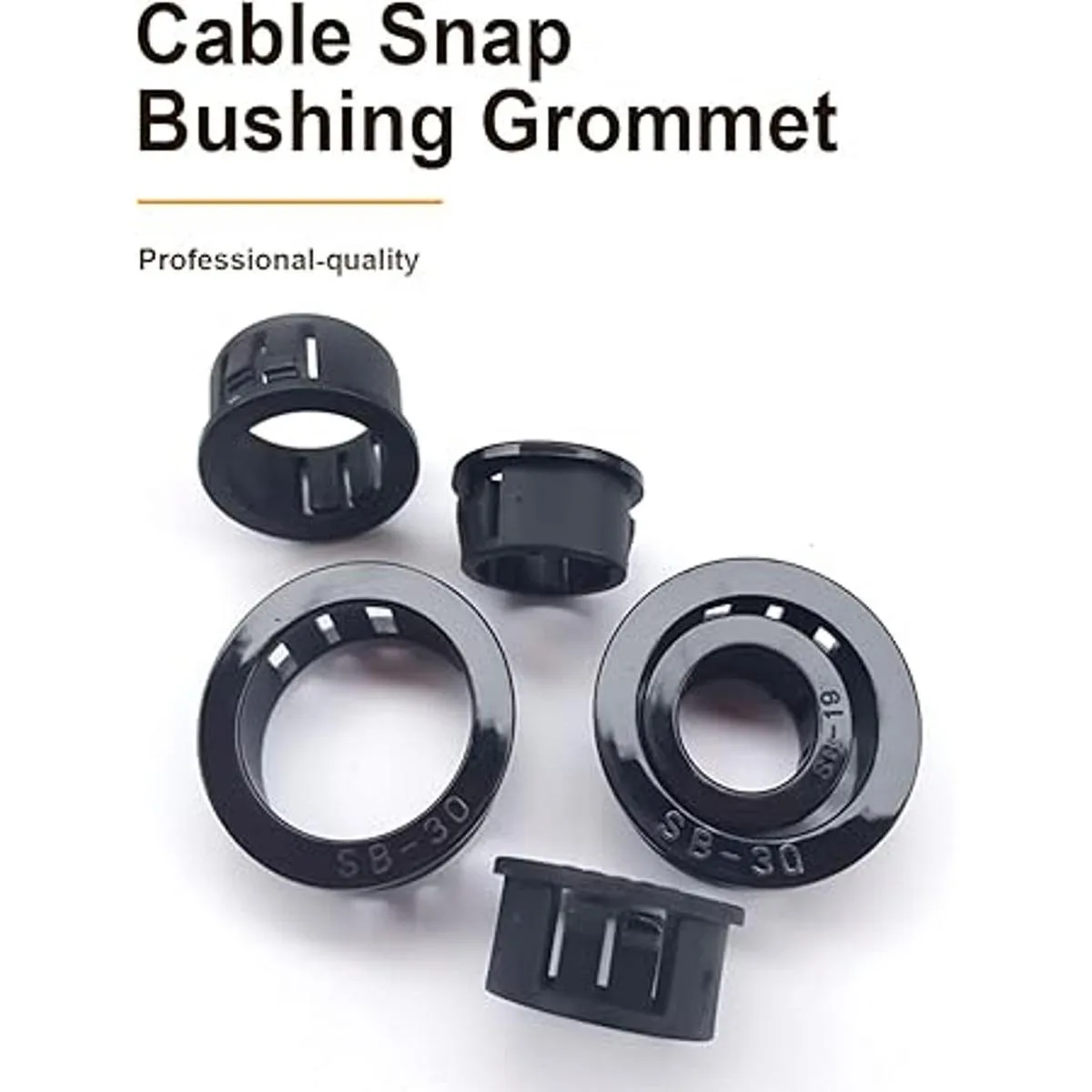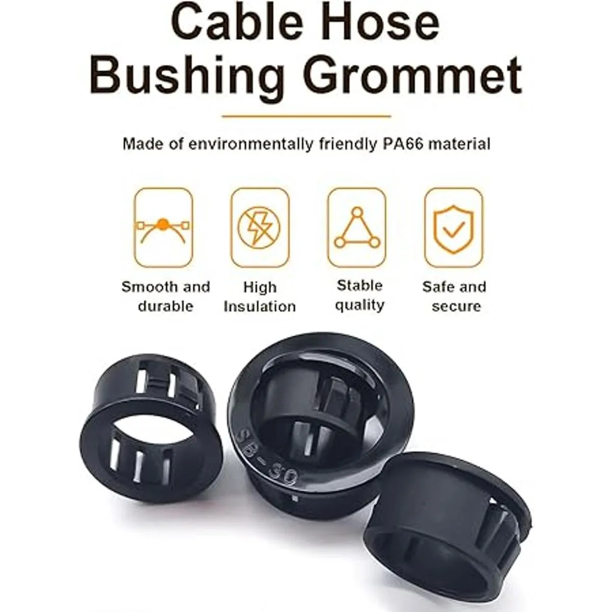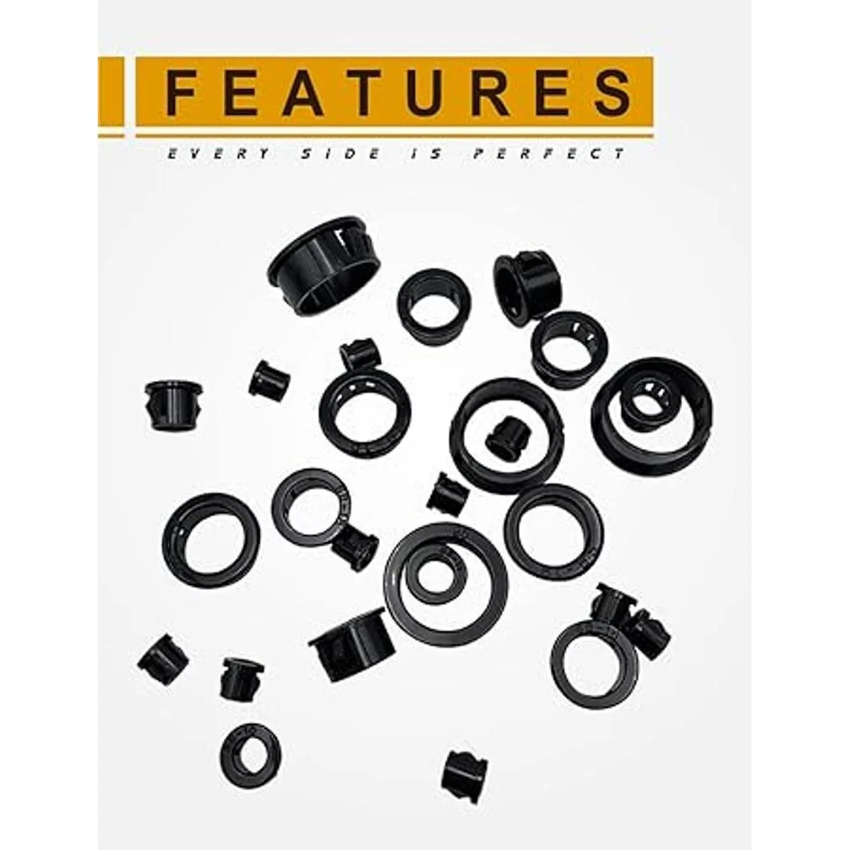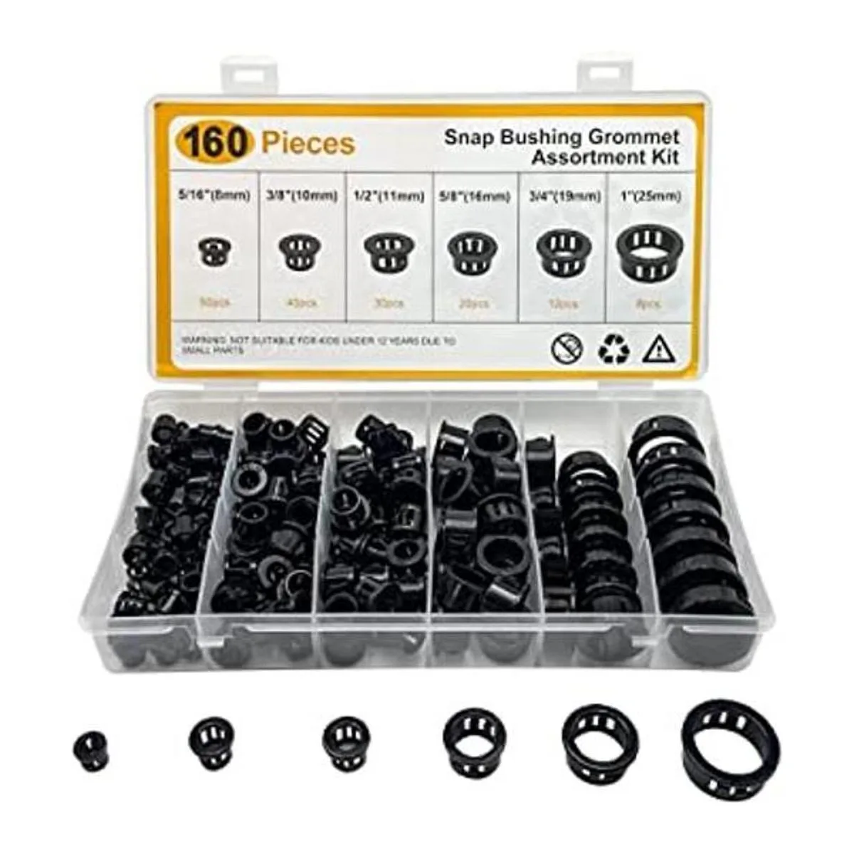 Surtido de bujes de plástico: 160 protectores de ojales de cable negro empaquetados en una caja organizadora de plástico transparente con tapa de cierre a presión, portátil y fácil de almacenar. Ojales de goma: 0.984 in, 8 unidades, 0.748 in, 12 unidades, 0.630 in, 20 unidades, 0.433 in, 30 unidades, 1.575 in, 50 unidades, 0.315 in, 50 unidades, apto para tus diversas necesidades.