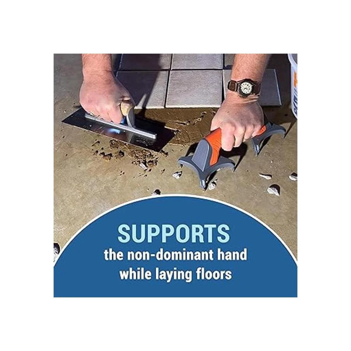Reduce la tensión en la parte inferior de la espalda y los ángulos de muñeca más saludables: en una mano, utilizas tu paleta para aplicar adhesivos, mortero, cemento, mientras que por otra parte, tienes un apoyo óptimo para evitar que las vértebras se tuerzan y mantiene tu mano de apoyo en un ángulo cómodo. Hace que tu suelo funcione más cómodo.