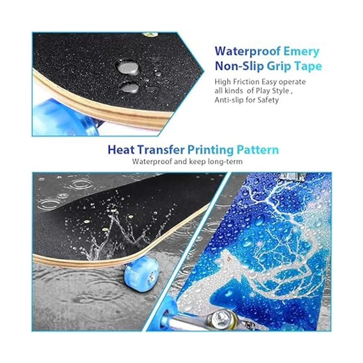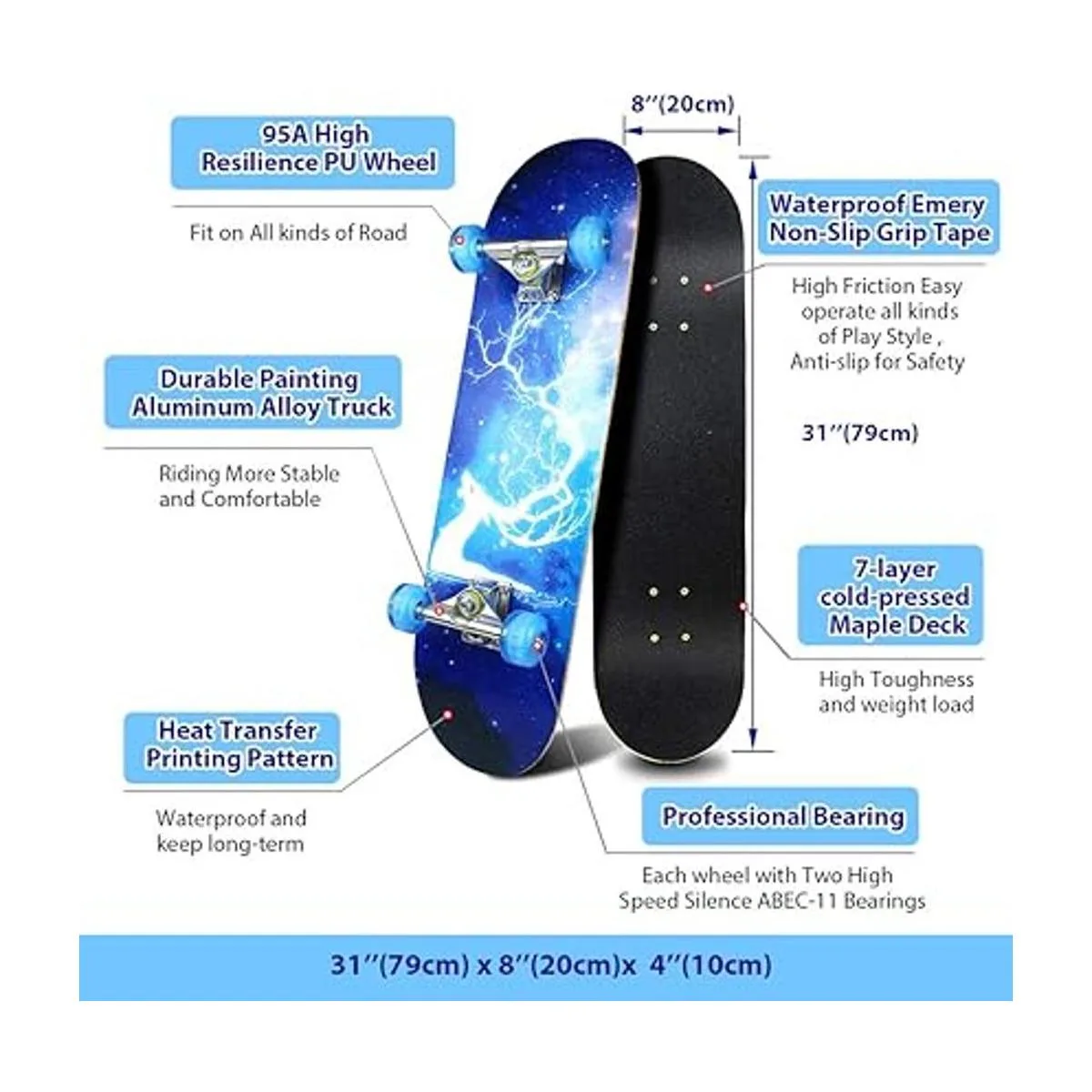 Material de la varilla: 7 capas de 31 pulgadas de largo x 8 pulgadas de ancho x 4 pulgadas de alto. La madera de arce hace que la cubierta de madera sea muy duradera y puede soportar 220 libras de peso. Las ruedas de poliuretano súper suaves cortan la amortiguación cuando conduces, el camión de aleación proporciona una estructura más estable para patineta, los rodamientos ABEC11 hacen que las ruedas giren más suavemente. Patrón: transferencia de calor que se imprime en la tabla, no es una calcomanía. hace que el patrón sea duradero durante mucho tiempo.