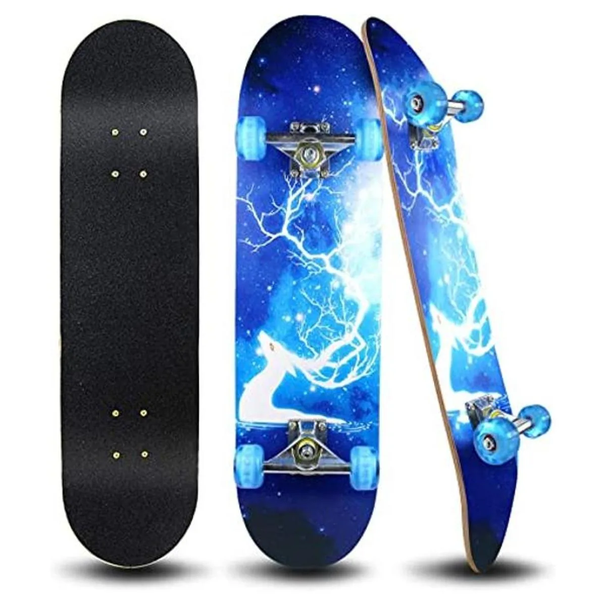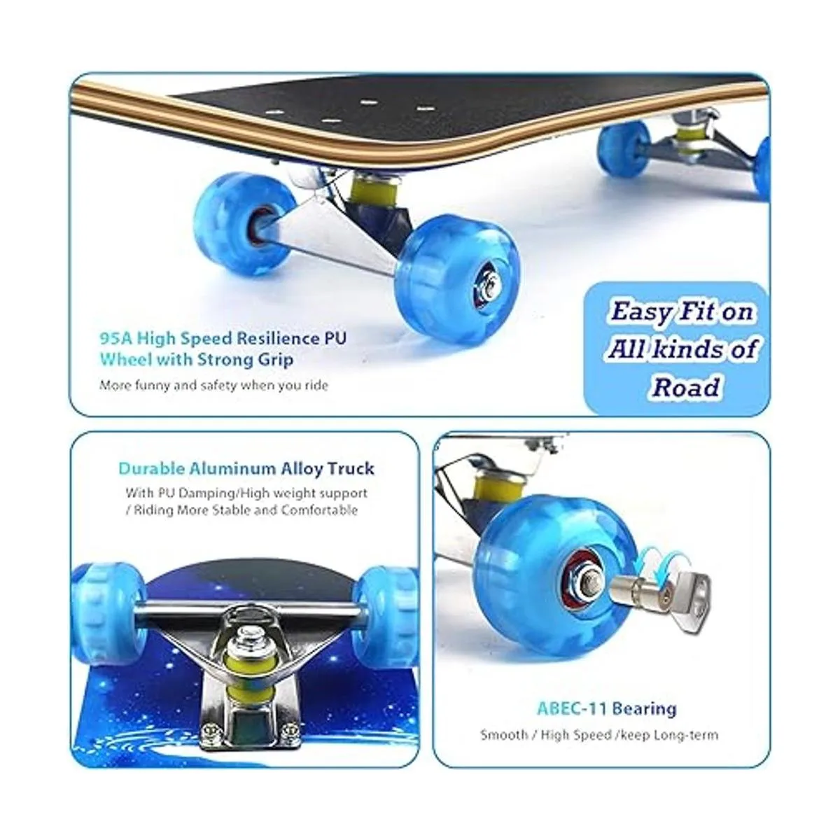 Fácil de montar: patineta completa de 31 pulgadas, con ruedas intermitentes de poliuretano se iluminarán cuando lo usas te hacen seguro cuando conduces en un lugar oscuro y la cubierta de madera pulida antideslizante de 8 pulgadas de ancho no solo puede proporcionar más estabilidad y seguridad para los usuarios, sino que también sostiene ambos pies en él. Soporta un peso de hasta 224 libras, lo que puede ser adecuado para todo tipo de personas.