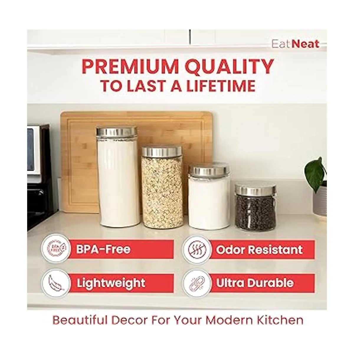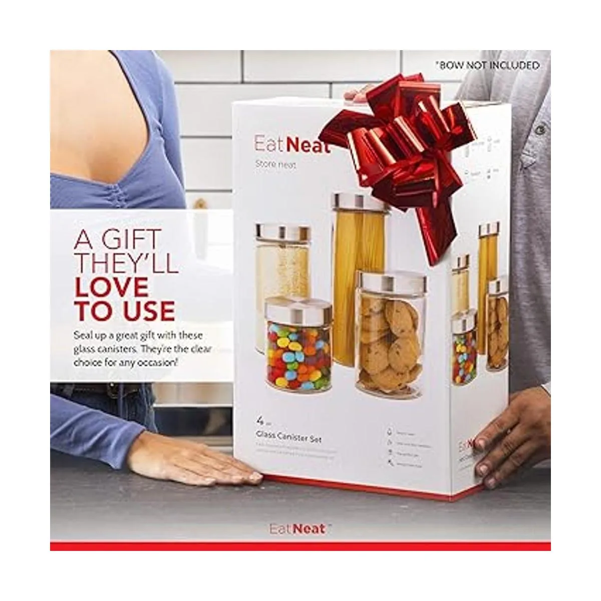 EatNeat Hermosos recipientes de cocina de vidrio de 4 piezas con tapas de acero inoxidable, recipientes de almacenamiento de alimentos que ofrecen un estilo moderno y una organización de cocina limpia, tamaños de 72, 55, 38 y 27 onzas