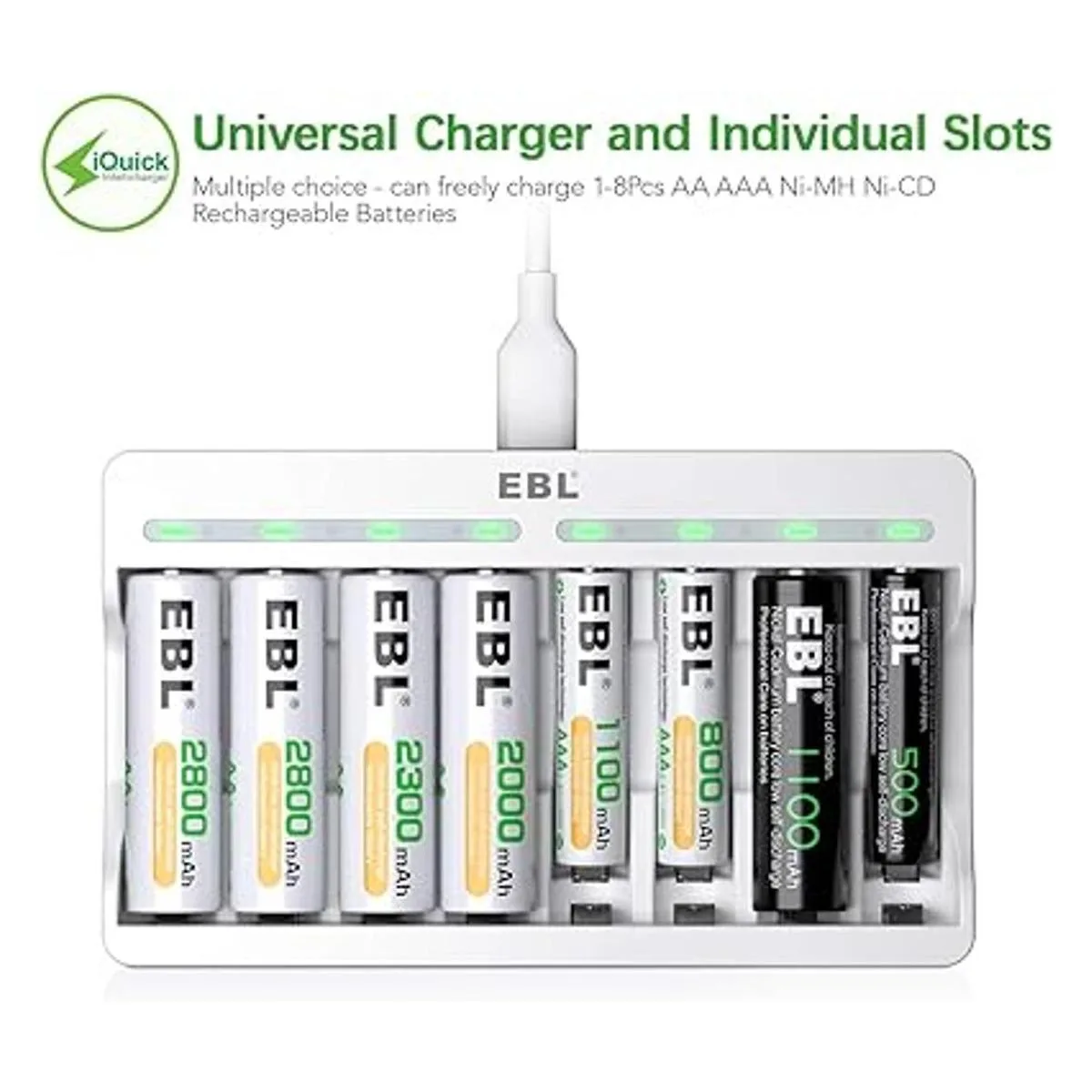 EBL Baterías AA recargables de 2800 mAh paquete de 4 y pilas recargables AAA NiMH de 1100 mAh paquete de 4 con cargador de batería individual AA AAA de 8 bahías