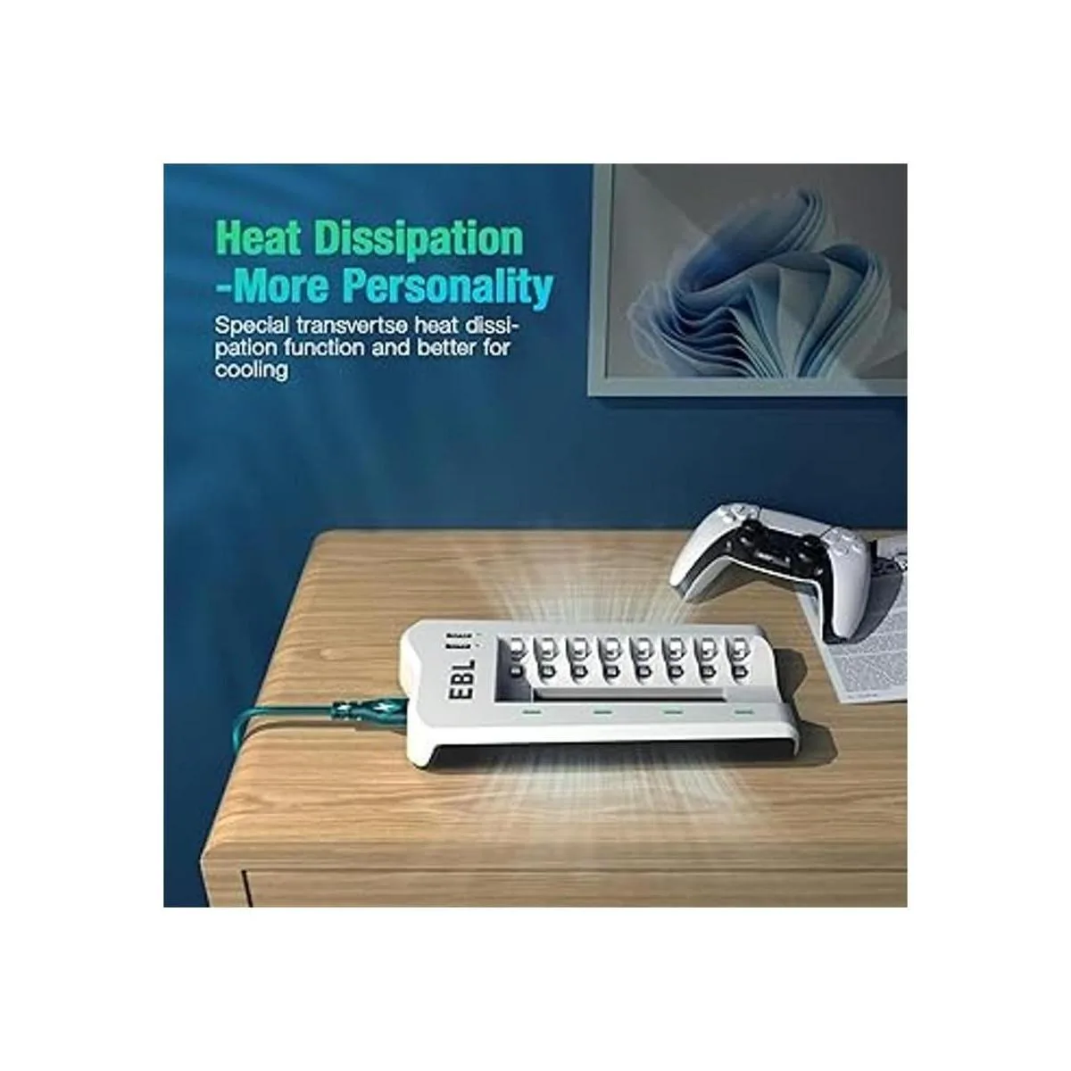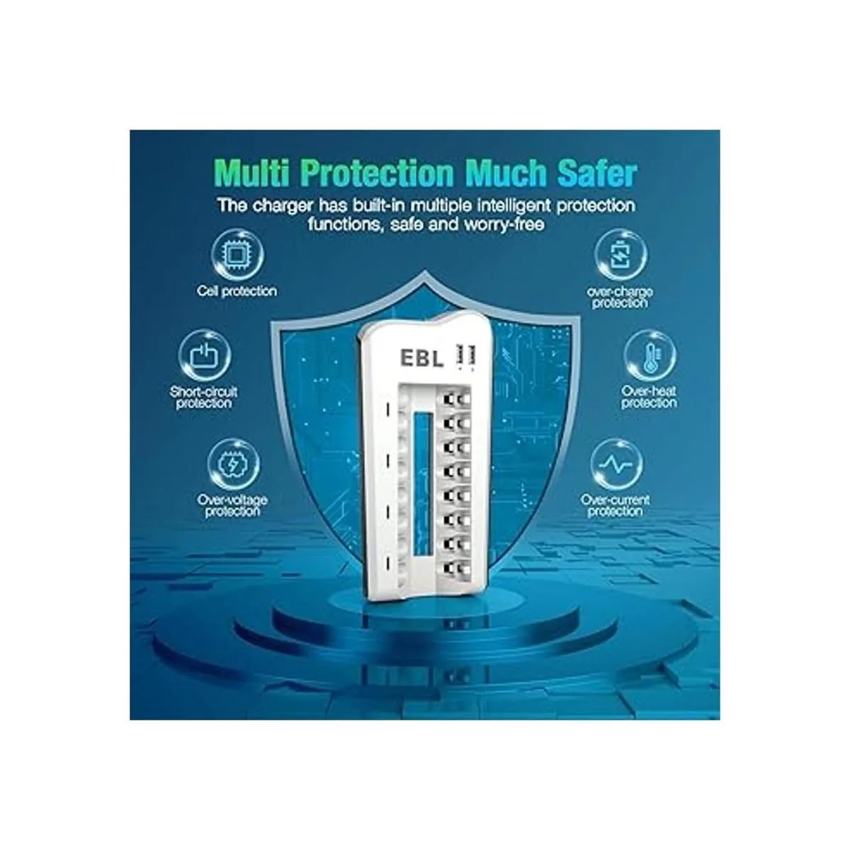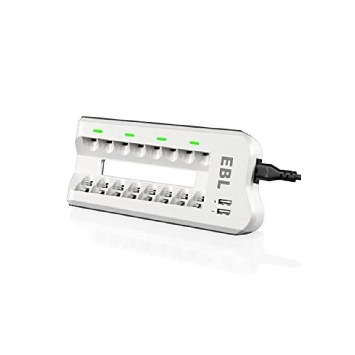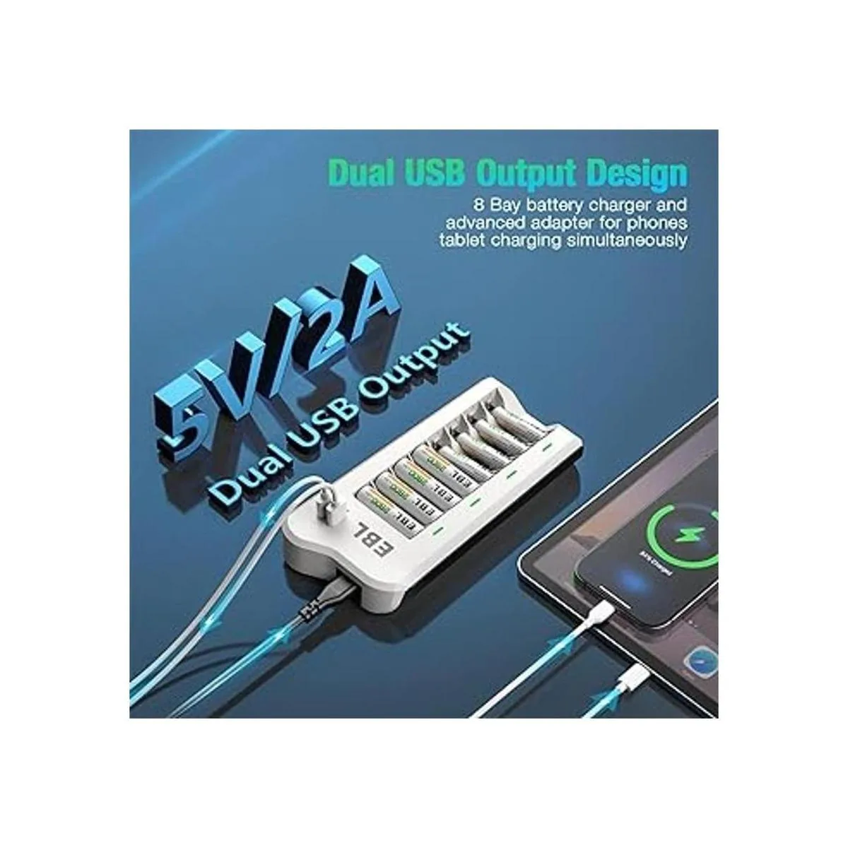 EBL Cargador de batería inteligente AA AAA de 8 bahías para baterías recargables NiMH NiCD integradas, 2 puertos de carga rápida USB