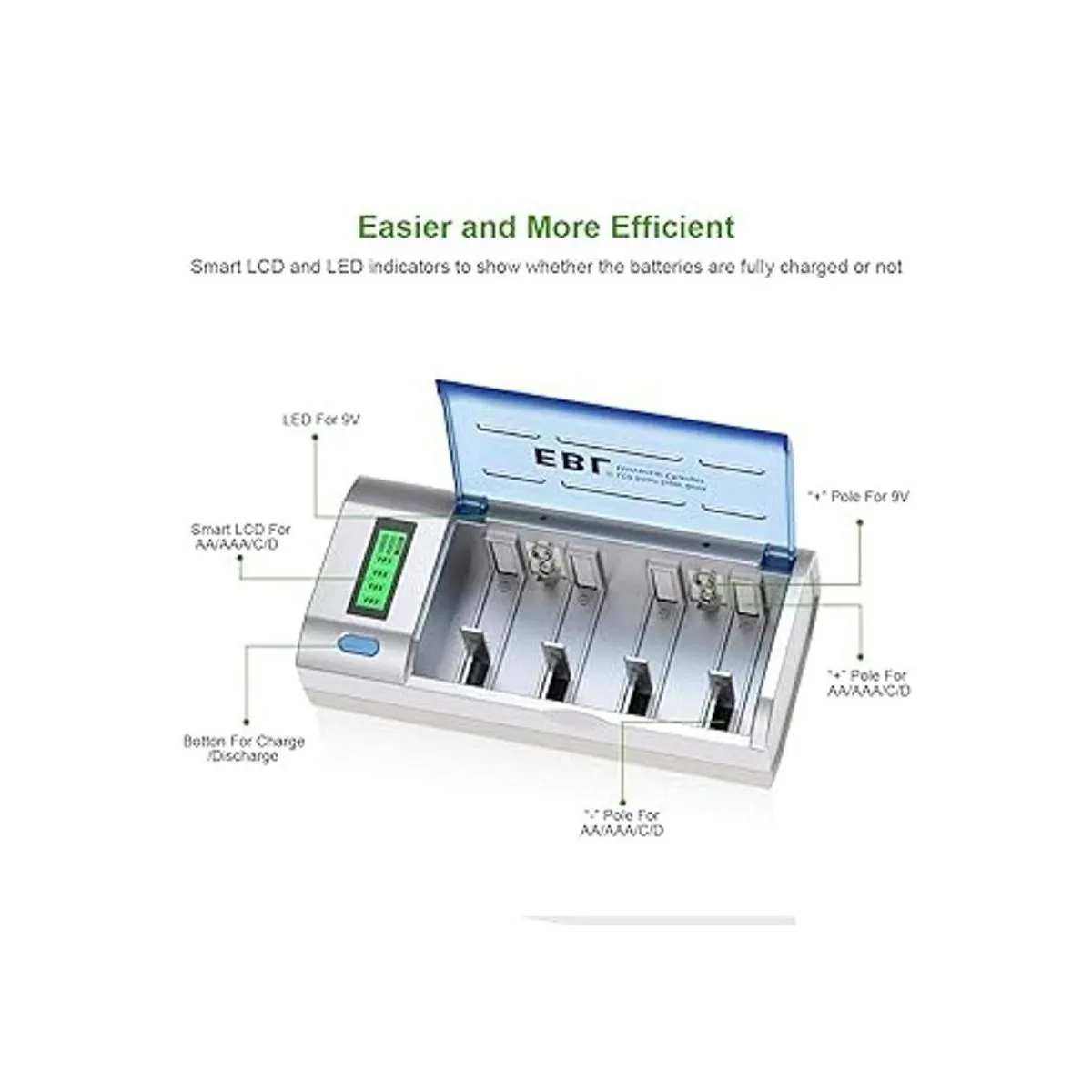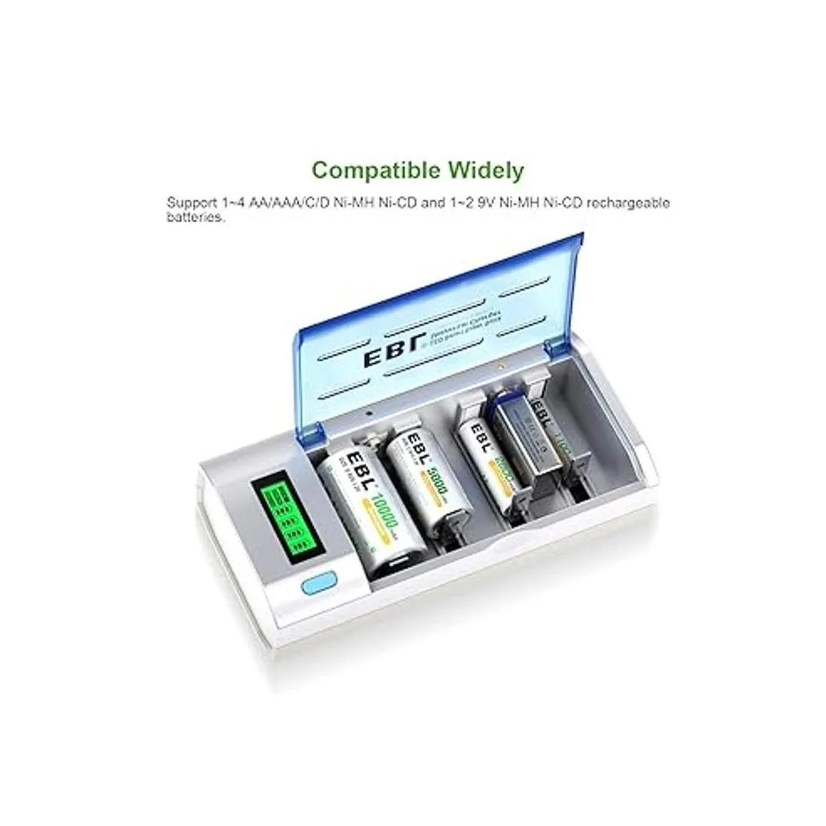 EBL Cargador de batería inteligente para baterías recargables C D AA AAA 9V NiMH NiCD con función de descarga y pantalla LCD