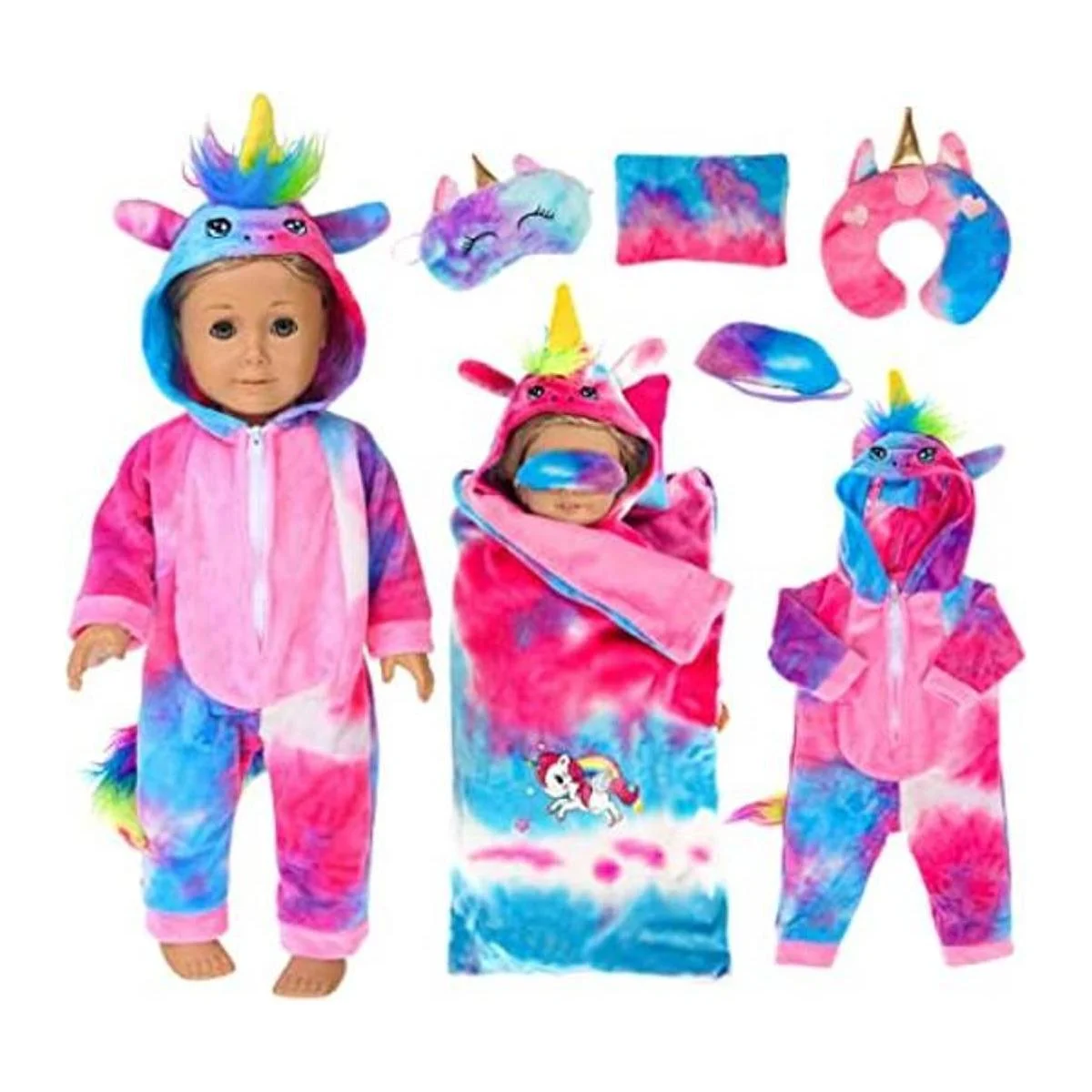 ebuddy Juego de 6 piezas, diseño de unicornio en teñido anudado colorido, saco de dormir y accesorios para muñecas de 18 pulgadas y muñecas recién nacidas de 16 a 18 pulgadas