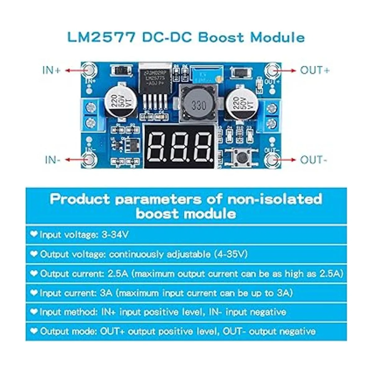 Fácil de usar: con bloques de terminales, se puede utilizar fácilmente sin soldador, y los puntos de conexión del cable de soldadura están reservados. El paquete incluye: 2 módulos de refuerzo LM2577 DCDC