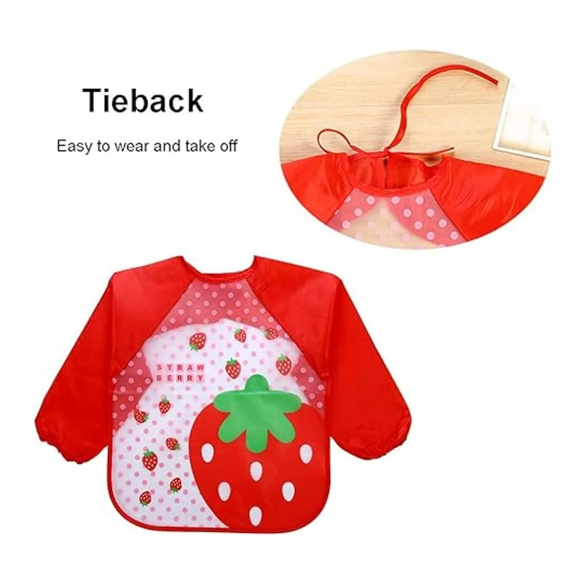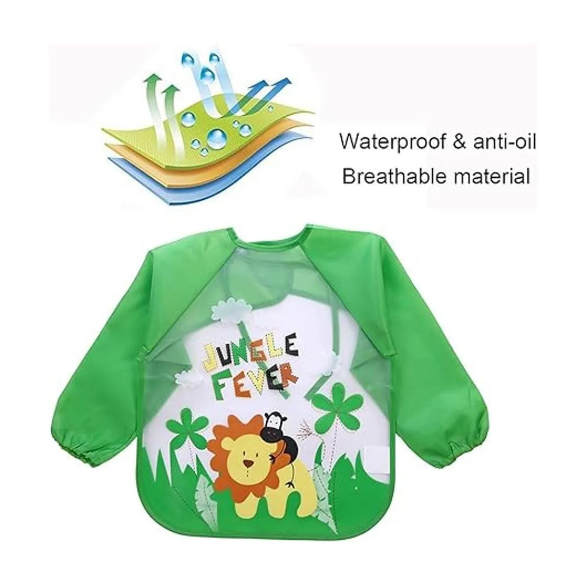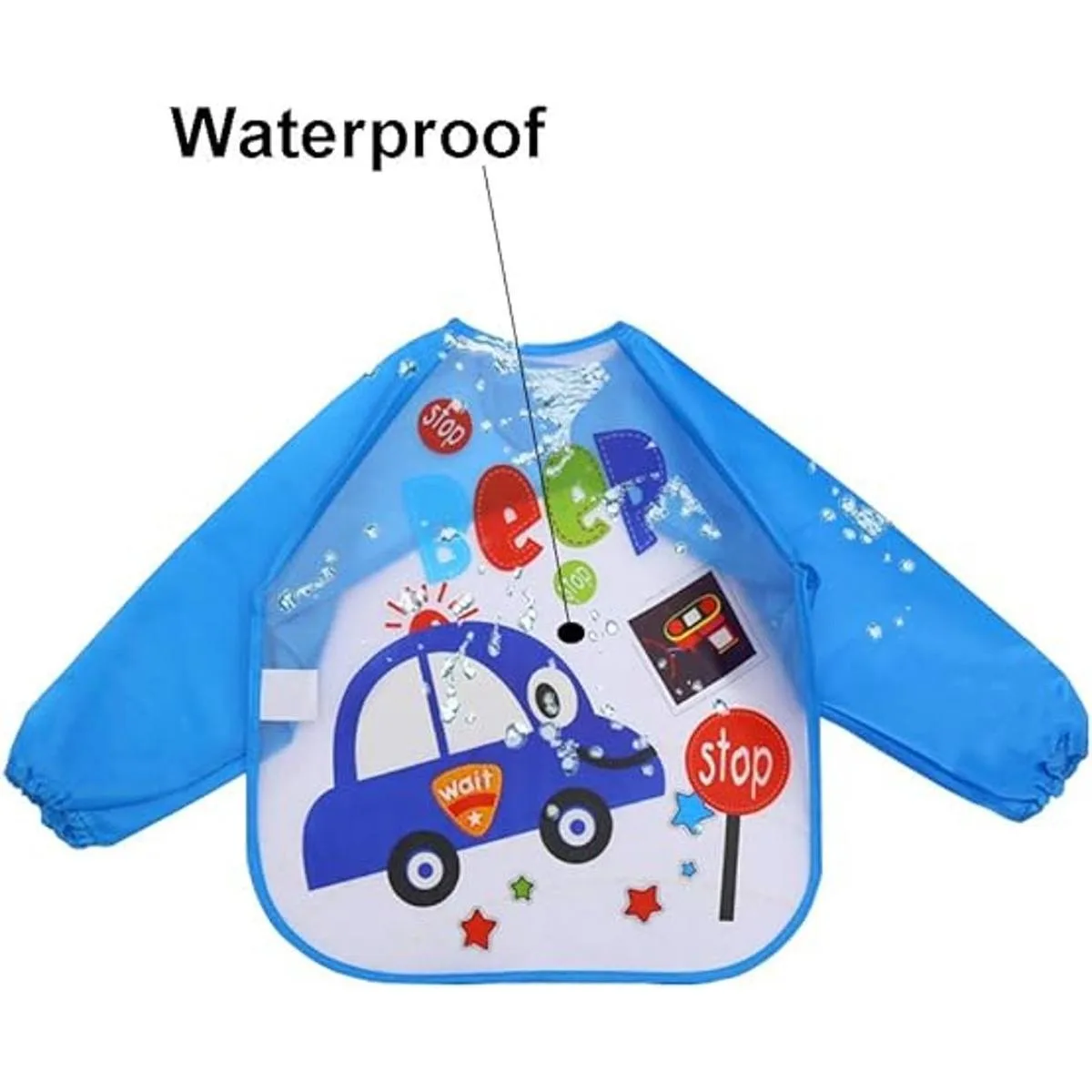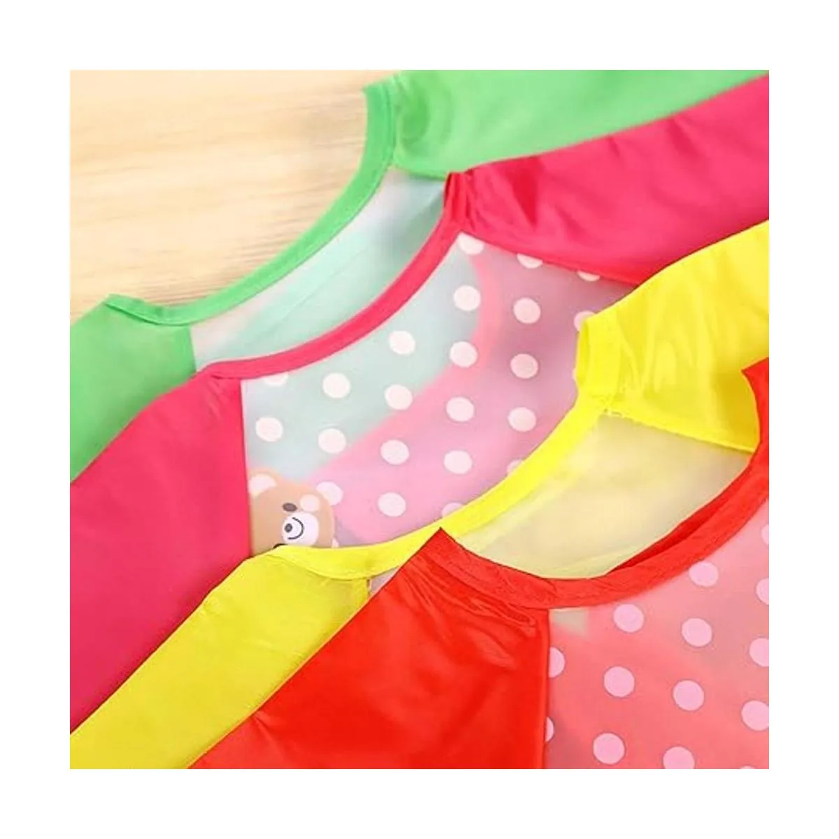 Las batas impermeables están diseñadas con una hermosa y bonita imagen de dibujos animados, deja que tu bebé le guste usarlo. Lazo en el cuello de la bata, mangas largas con elástico. Se puede ajustar para que los niños lo usen cómodamente.