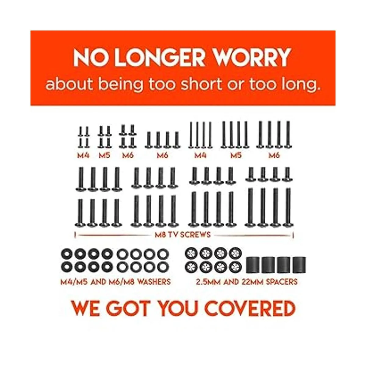 El paquete contiene tornillos y espaciadores de TV M4, M5, M6 y M8 para montar prácticamente todos los televisores de hasta 80 pulgadas. Se asegurará de que no estés atornillado cuando se trata de montar tu televisor.