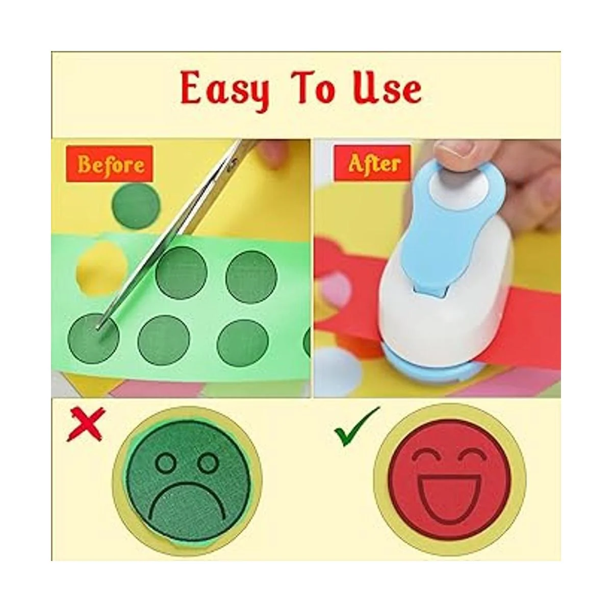 Fácil de usar: con una palanca ergonómica y fácil de usar, te encantará lo rápida y fácil que puedes cortar círculos nítidos para todos tus proyectos de manualidades de papel. Si lo giras boca abajo y sales del recogedor de plástico, puedes ver el papel antes de perforar.