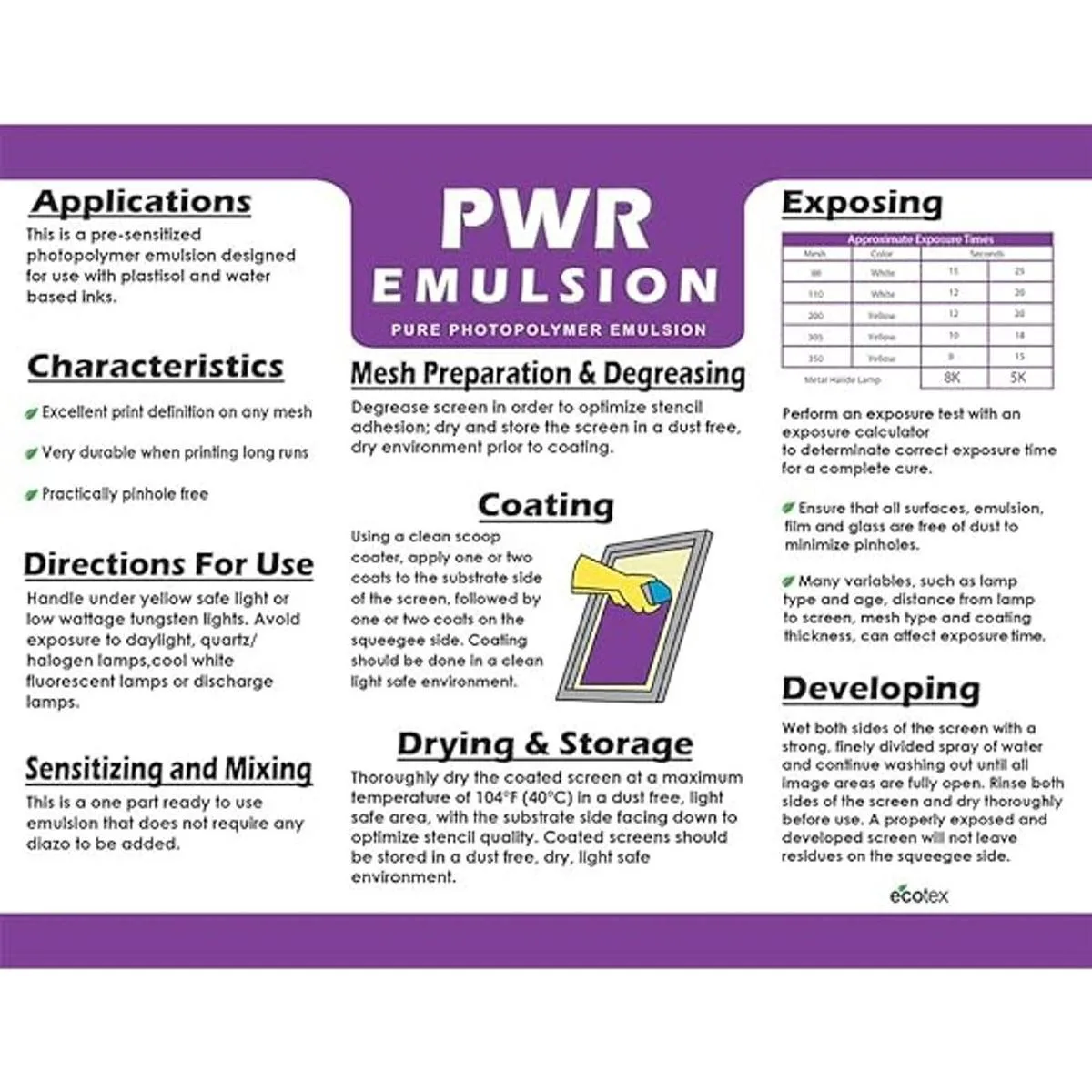 Ecotex PWR Emulsión de serigrafía cuarto de galón 32 onzas, emulsión fotográfica presensibilizada para serigrafía de seda y tela, para serigrafía, tinta de plastisol y tinta a base de agua, suministros de serigrafía