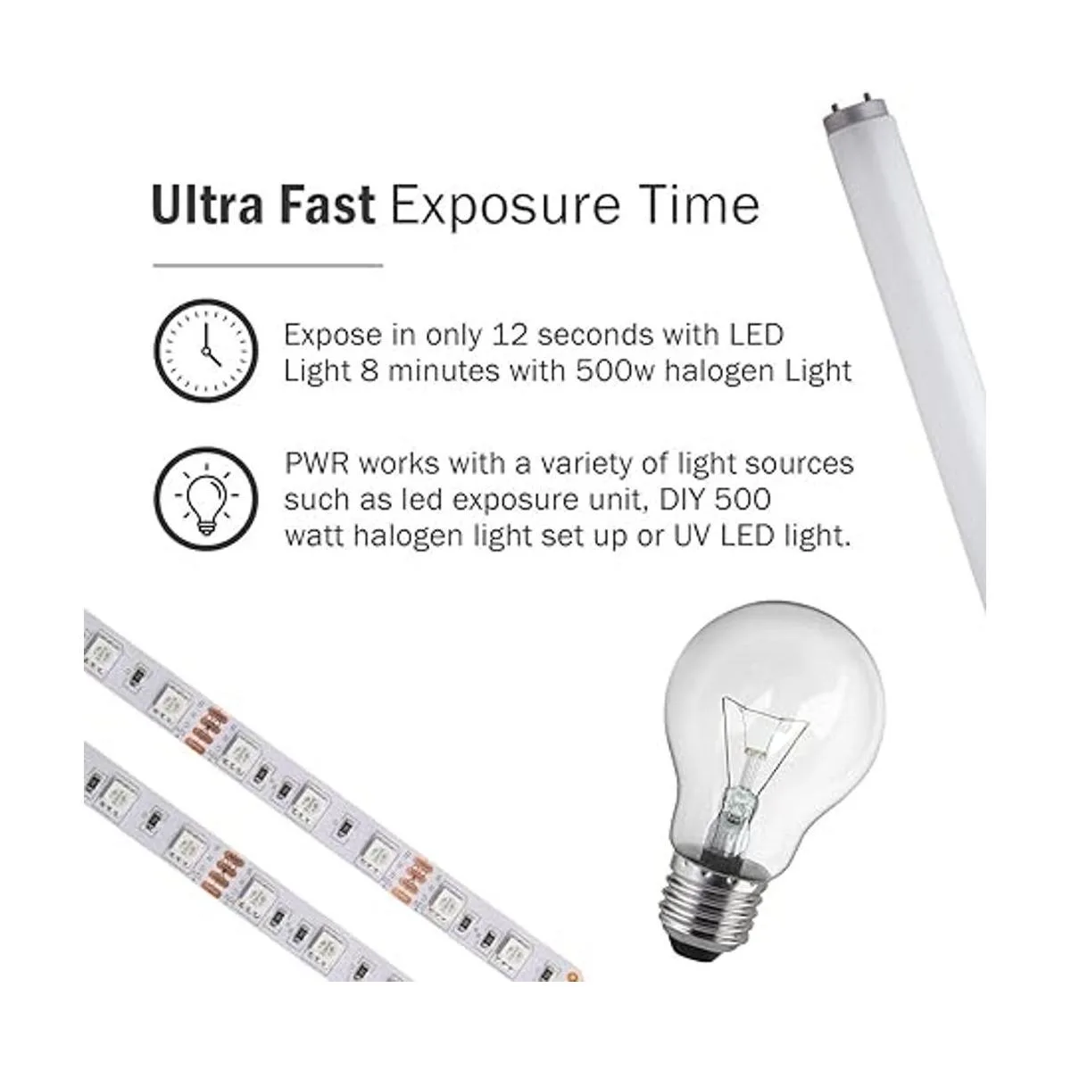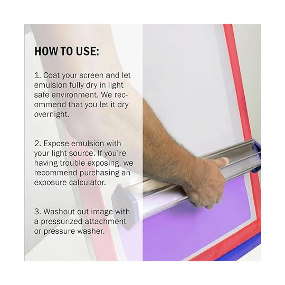 Funciona muy bien con todas las unidades de exposición: ya sea que estés utilizando una unidad de luz de exposición LED, configuración de luz halógena de 500 vatios o una luz LED ultravioleta, esta emulsión de pantalla de seda se expondrá rápida y fácilmente.